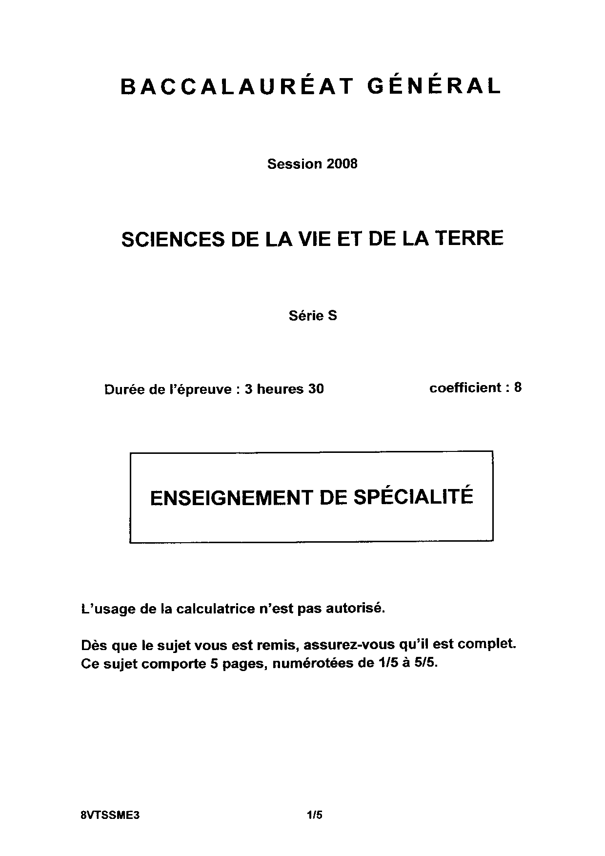 Bac S SVT (Spécialité) Métropole 2008 (Session de remplacement) - Sujet