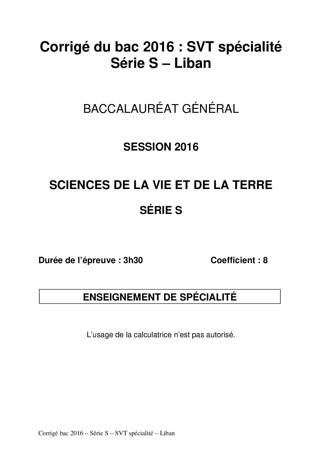 Bac S SVT (Spécialité) Liban 2016 - Corrigé