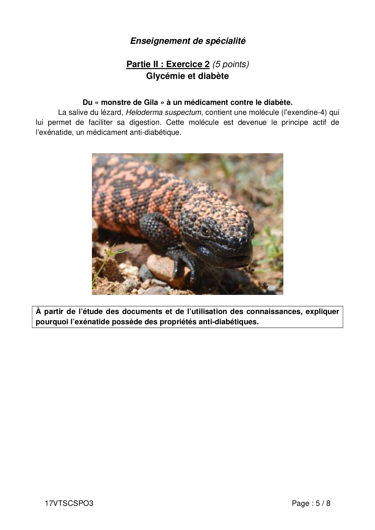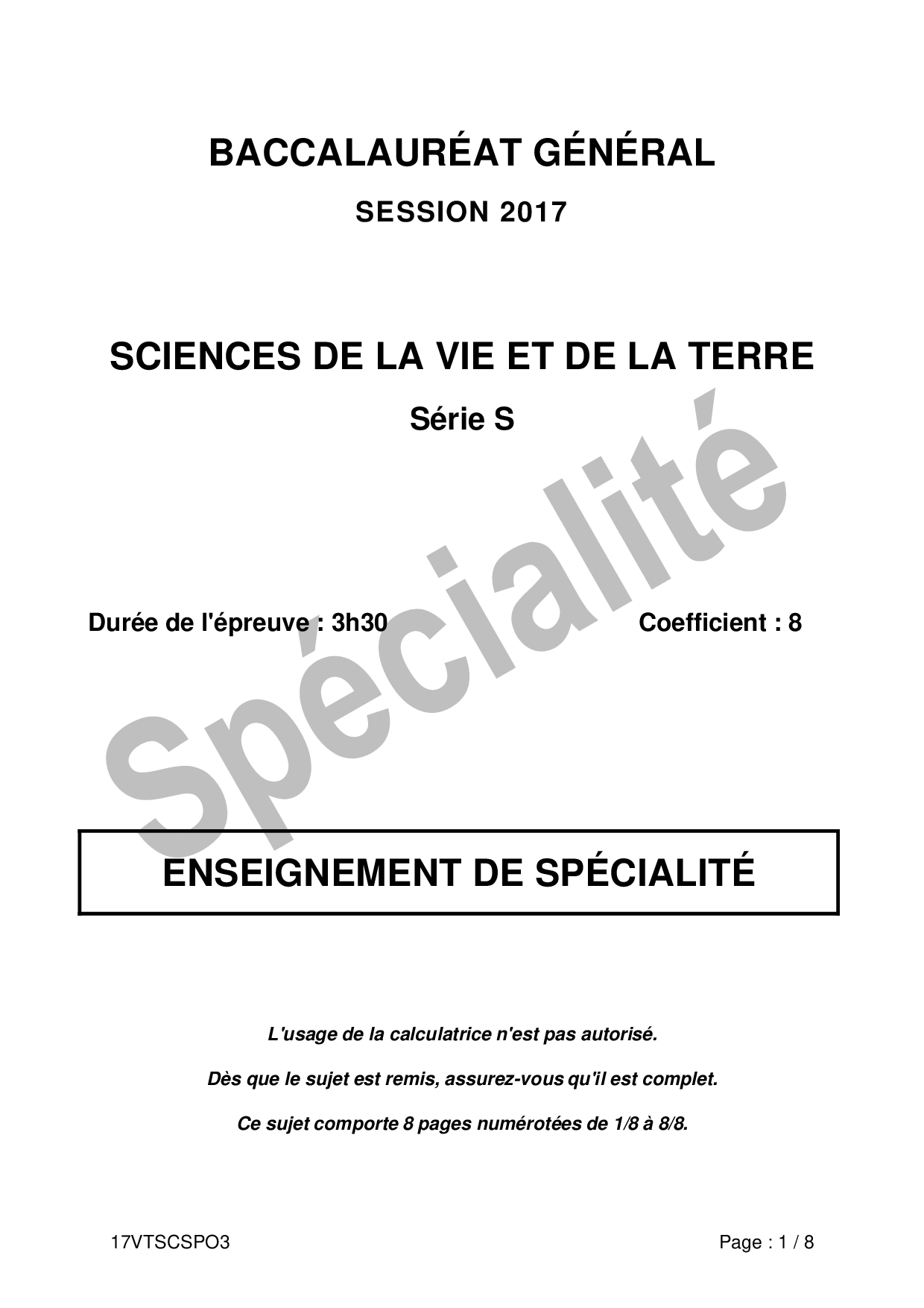 Bac S SVT (Spécialité) Polynésie 2017 (Session de remplacement) - Sujet