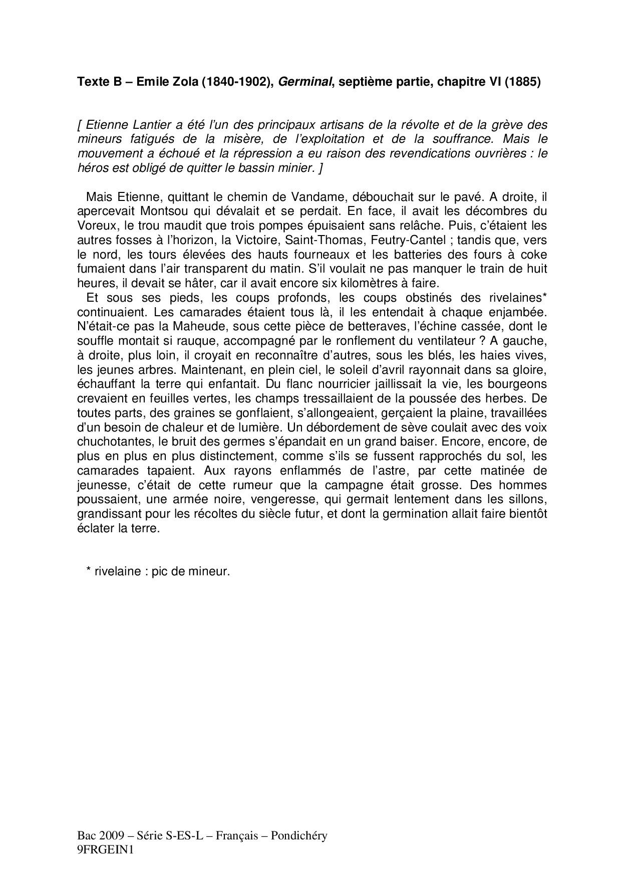 Bac S-ES Français (1ère) Pondichéry 2009 - Sujet