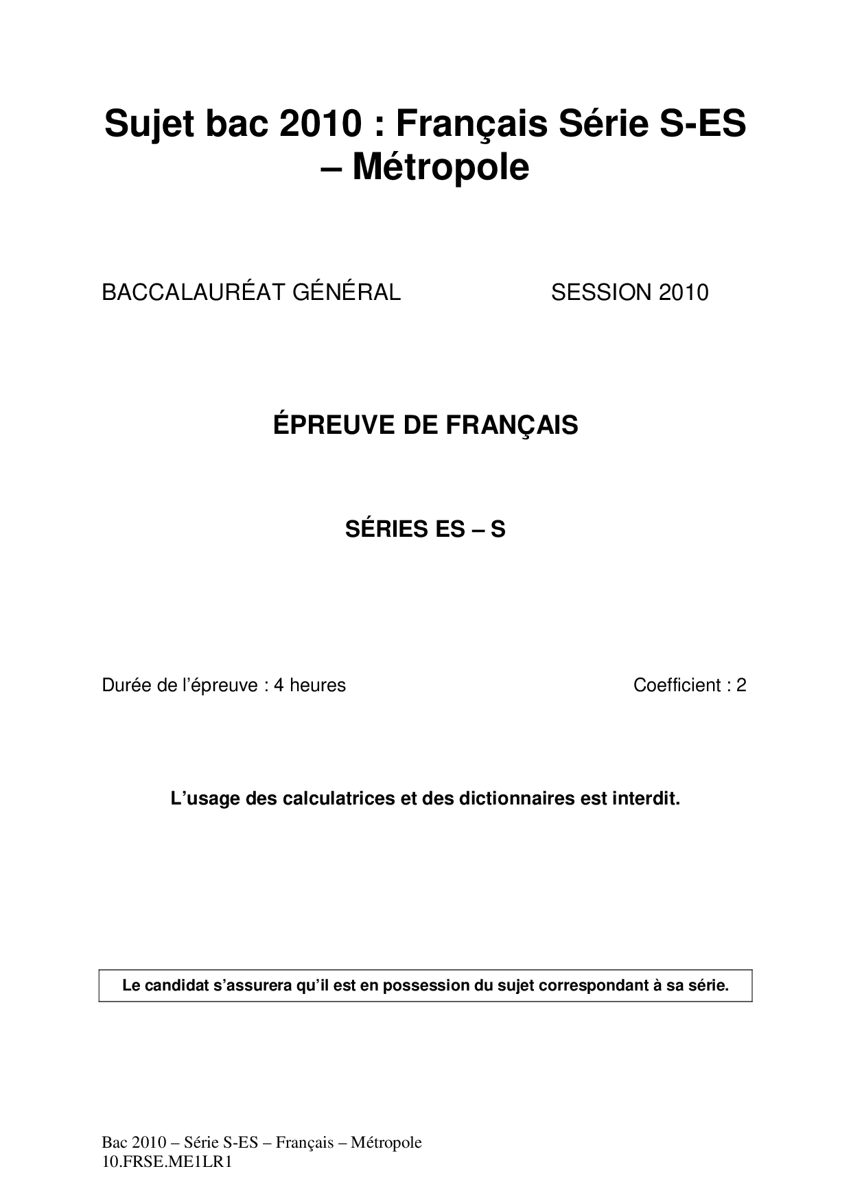 Bac S-ES Français (1ère) Métropole 2010 - Sujet