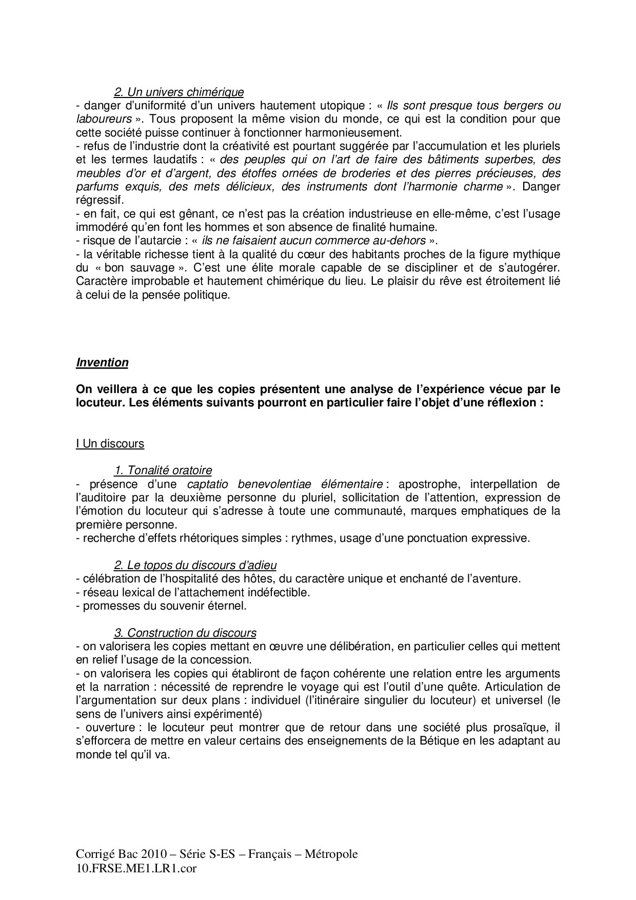 Bac S-ES Français (1ère) Métropole 2010 - Corrigé