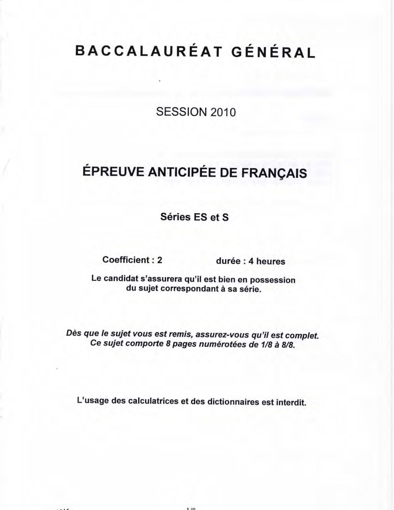 Bac S-ES Français (1ère) Amérique du Nord 2010 - Sujet