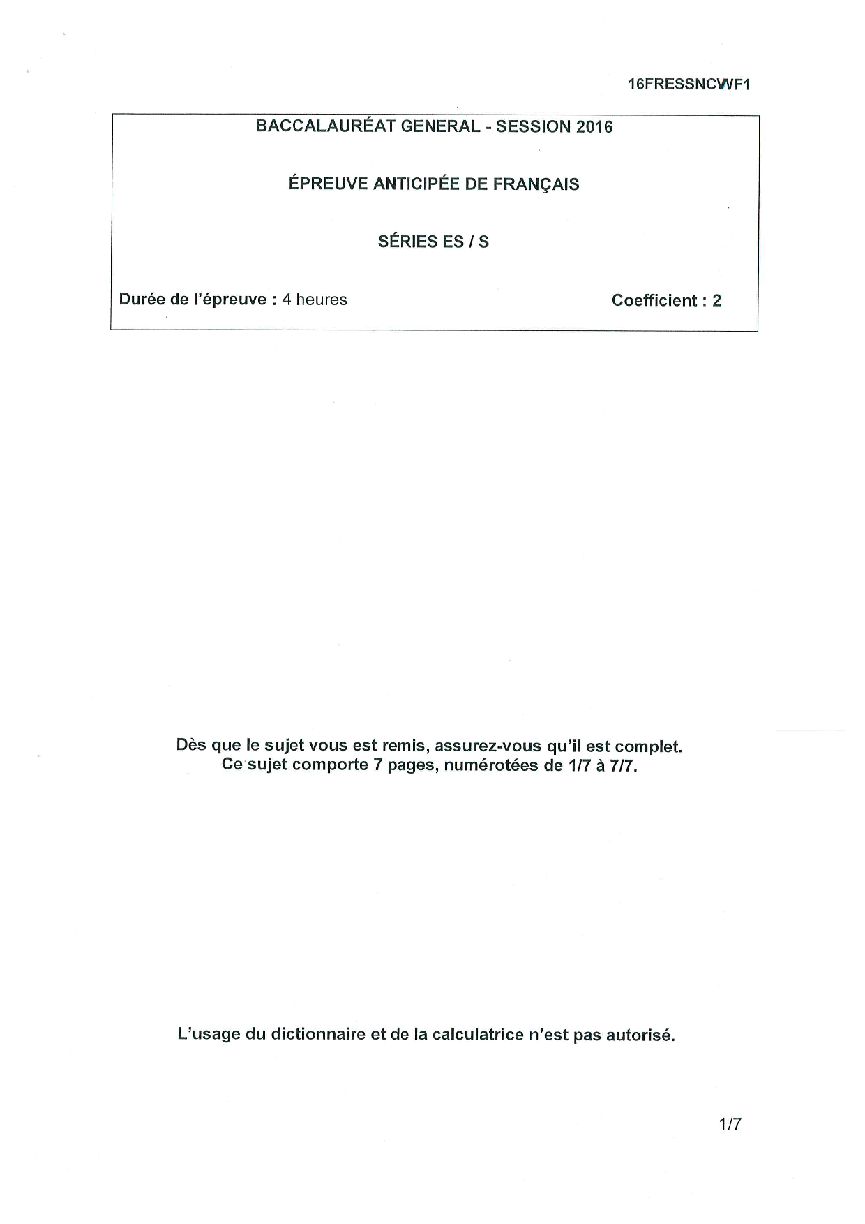 Bac S-ES Français (1ère) Nouvelle-Calédonie 2016 - Sujet