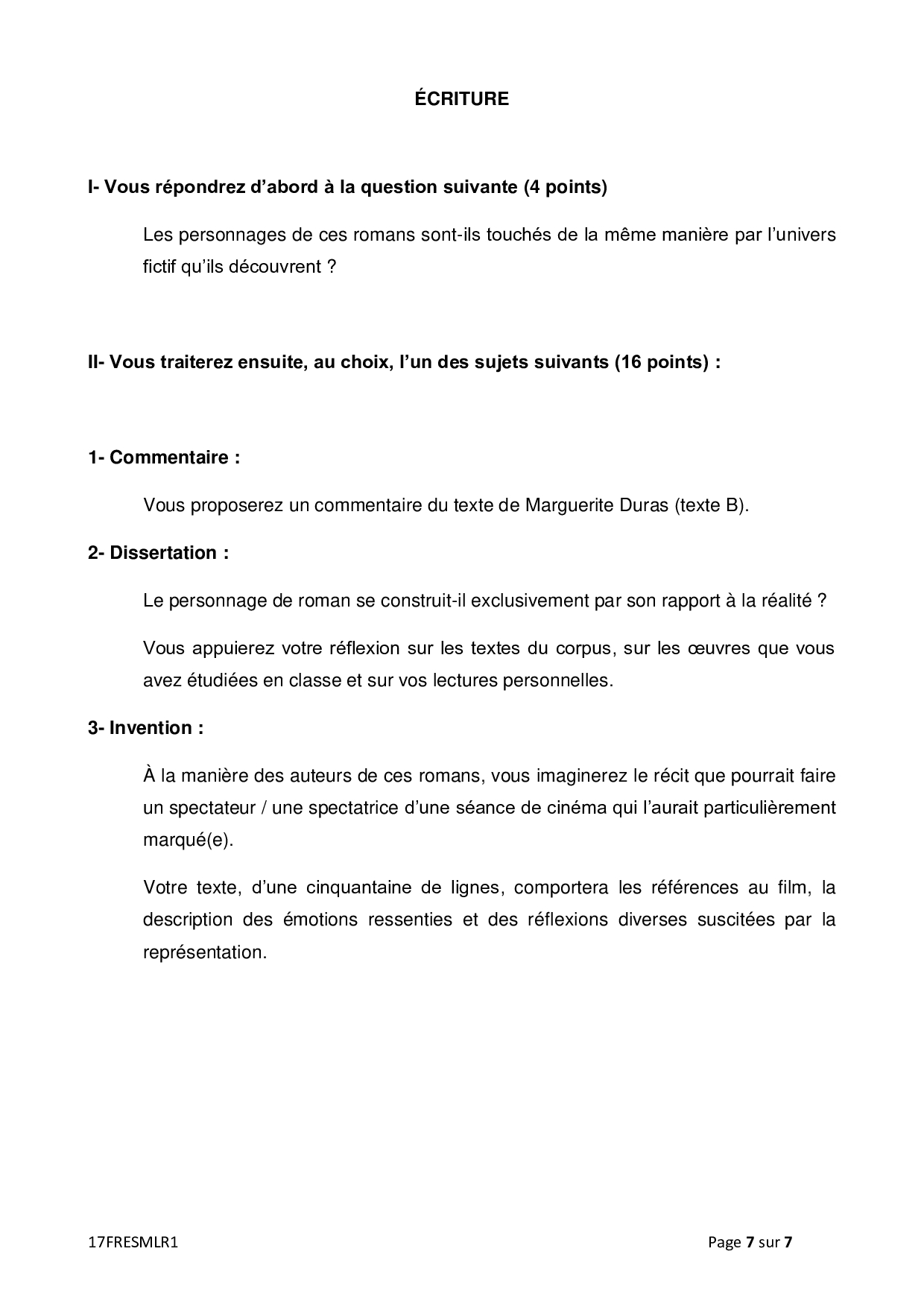 Bac S-ES Français (1ère) Métropole 2017 - Sujet