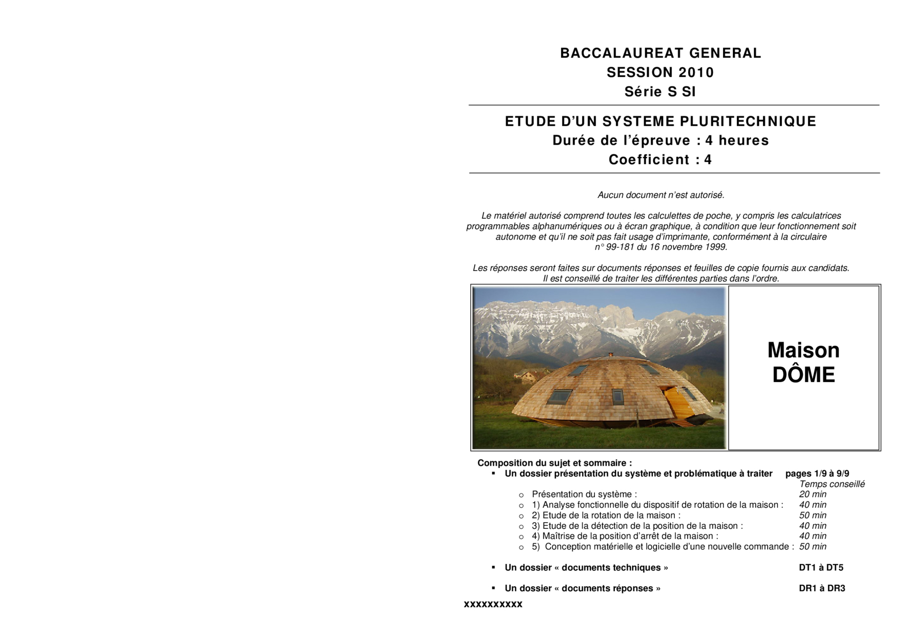 Bac S Sciences de l'Ingénieur (SI) Métropole 2010 - Sujet
