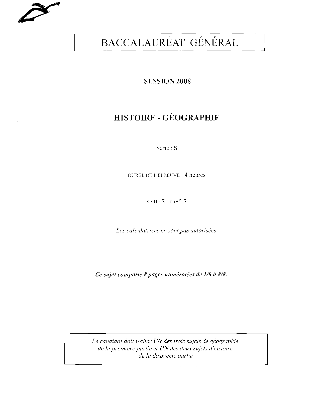 Bac S Histoire Géographie Nouvelle-Calédonie 2008 - Sujet