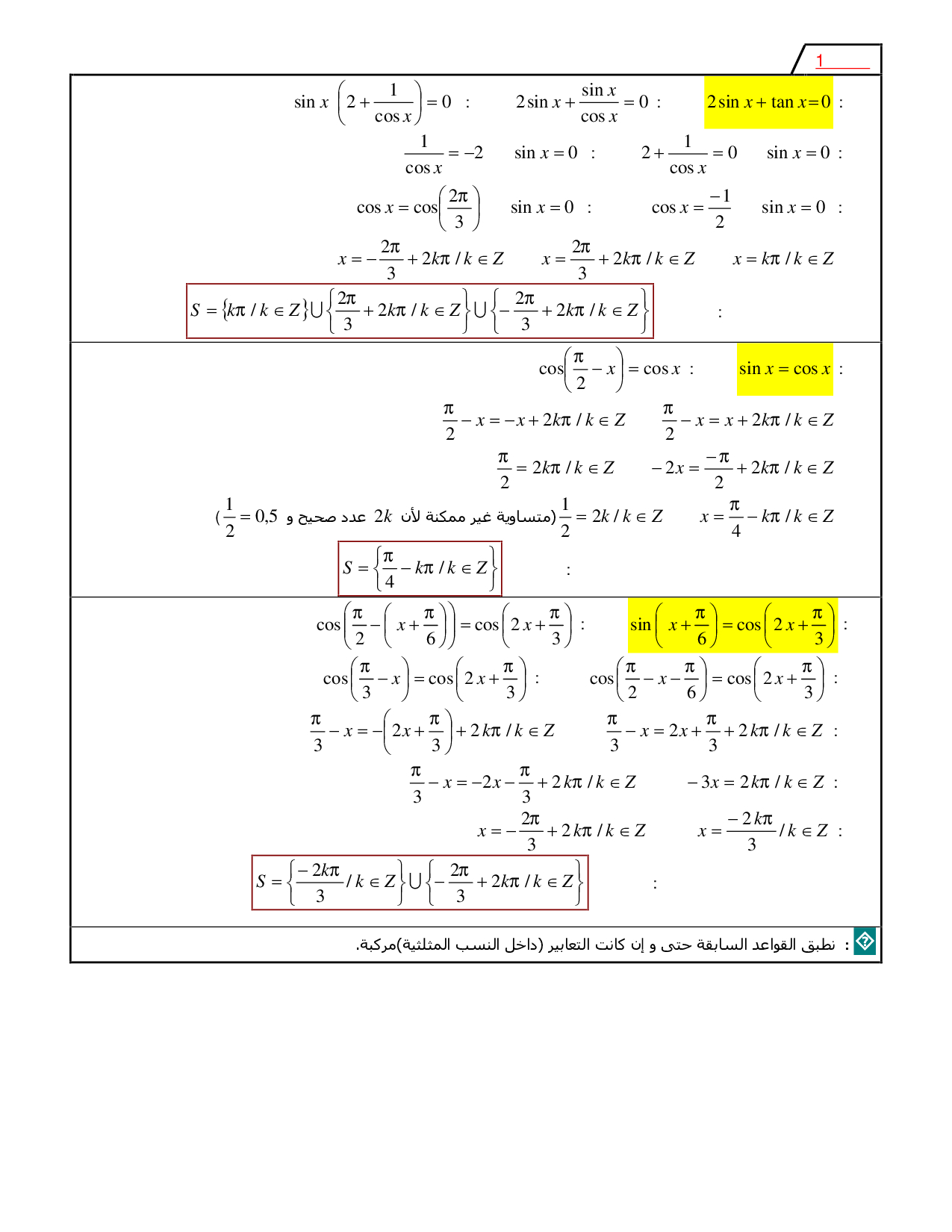 المعادلات والمتراجحات المثلثية - تصحيح سلسلة التمارين 1