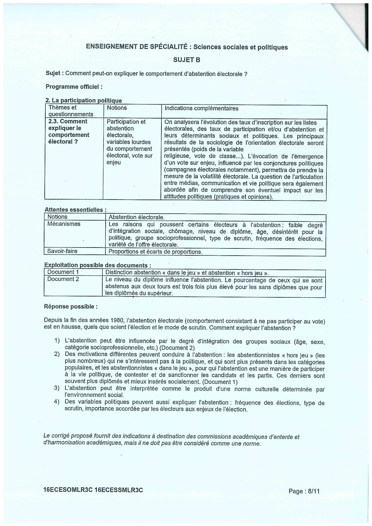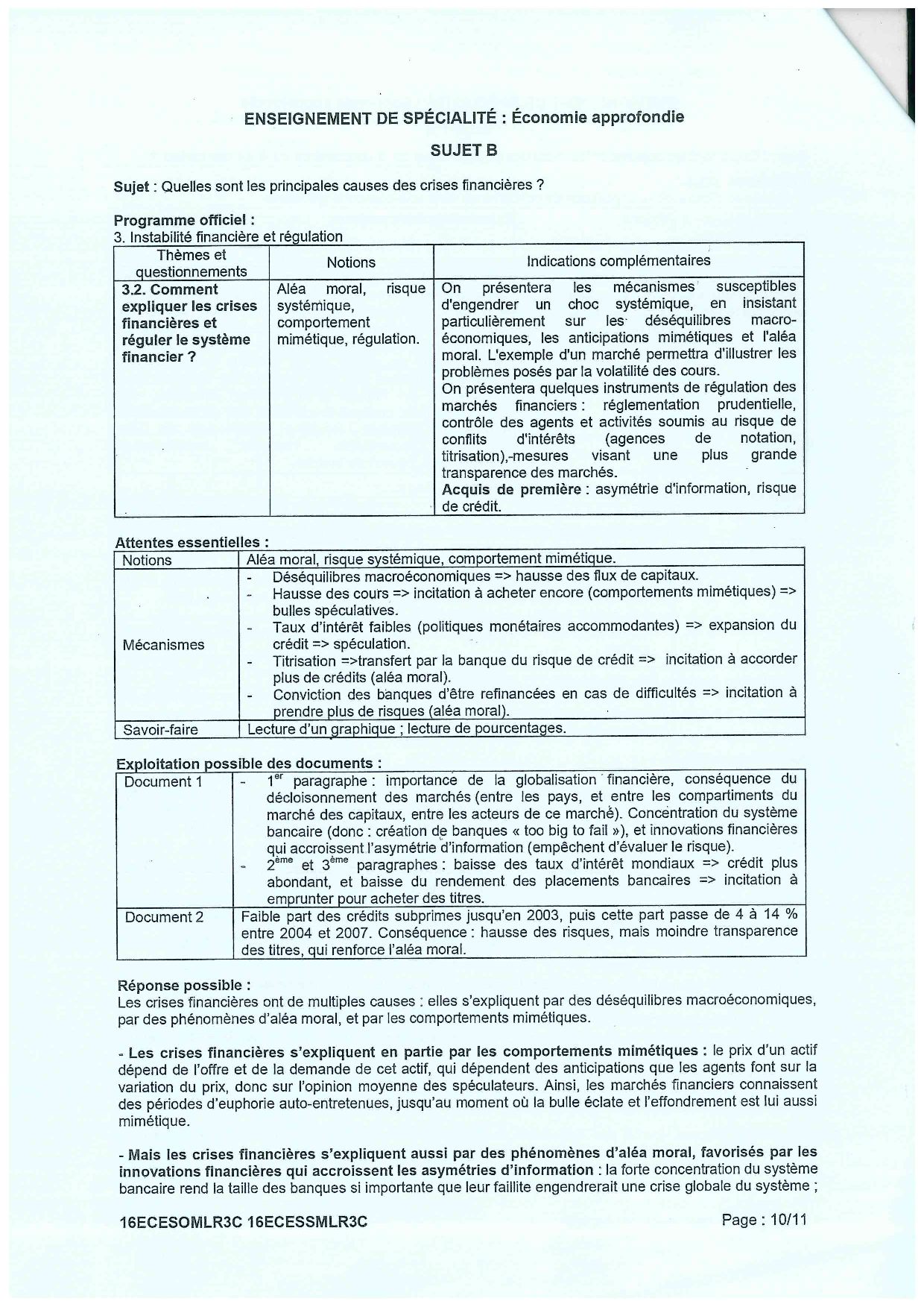 Bac ES Sciences Economiques et Sociales (SES) Métropole 2016 (Session de remplacement) - Corrigé