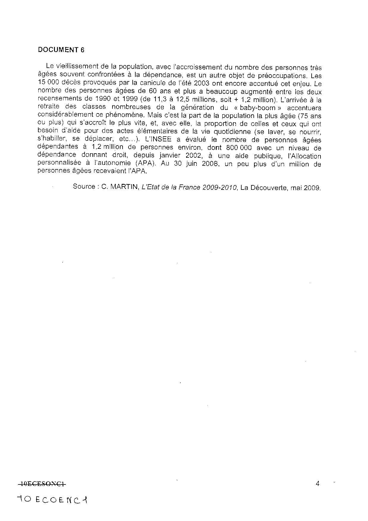 Bac ES Sciences Economiques et Sociales (SES Spécialité) Nouvelle-Calédonie 2010 - Sujet