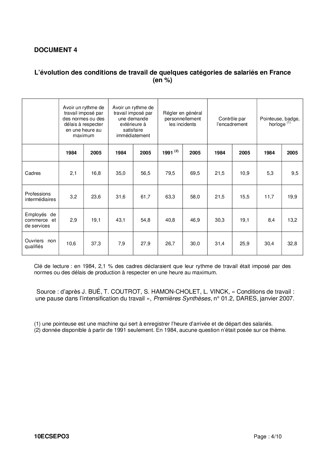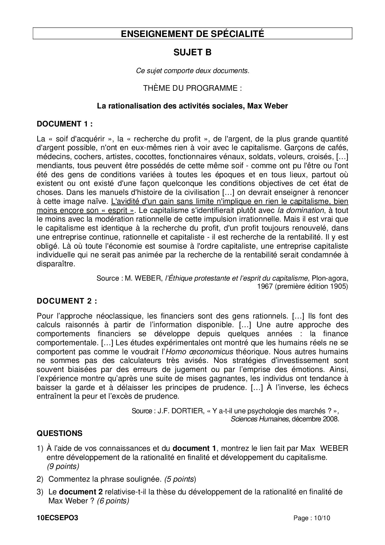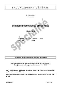 Bac ES Sciences Economiques et Sociales (SES Spécialité) Polynésie 2010 (Session de remplacement) - Sujet
