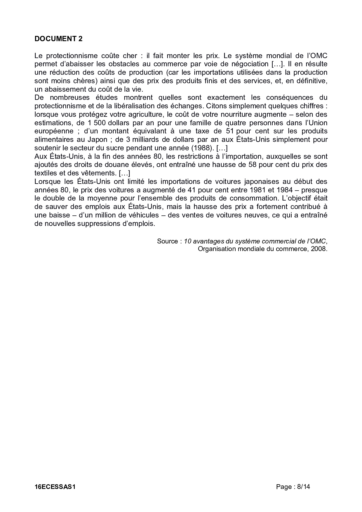 Bac ES Sciences Economiques et Sociales (SES Spécialité) Amérique du Sud 2016 - Sujet