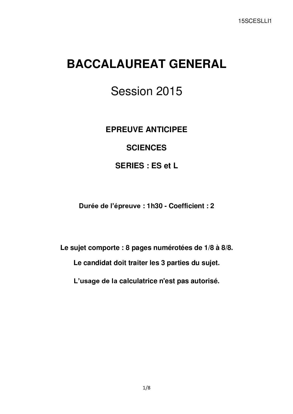 Bac ES-L Sciences (1ère) Liban 2015 - Sujet