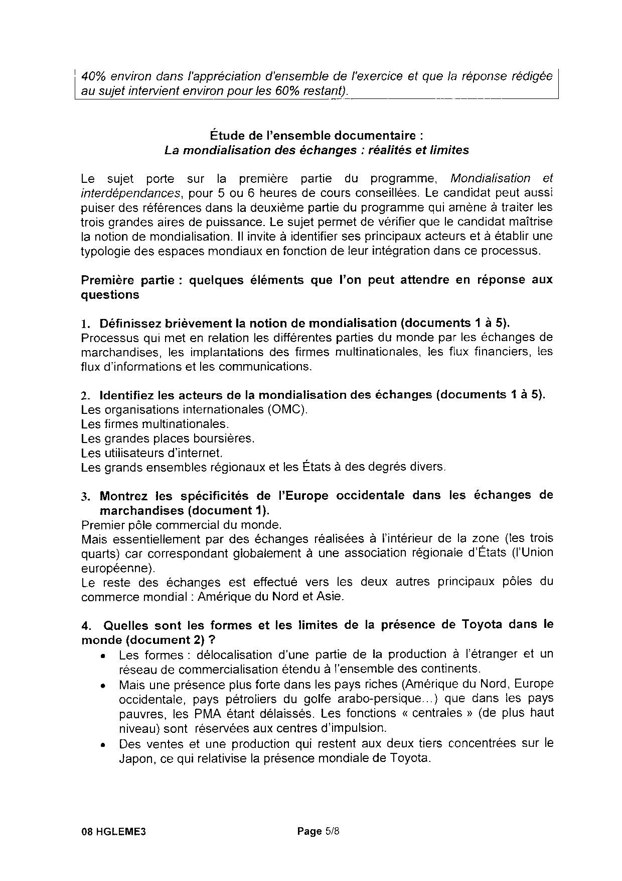 Bac ES-L Histoire Géographie Métropole 2008 (Session de remplacement) - Corrigé