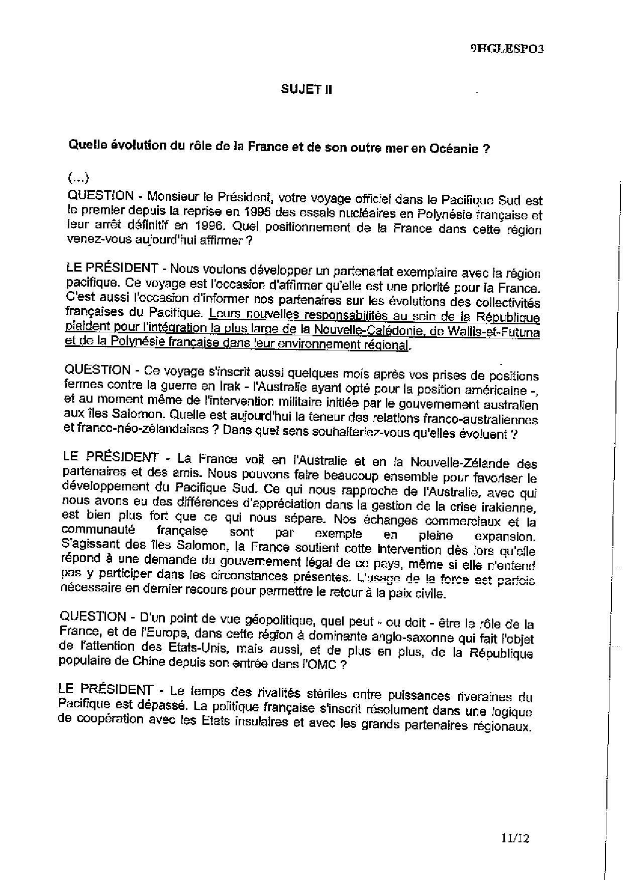 Bac ES-L Histoire Géographie Polynésie 2009 (Session de remplacement) - Sujet
