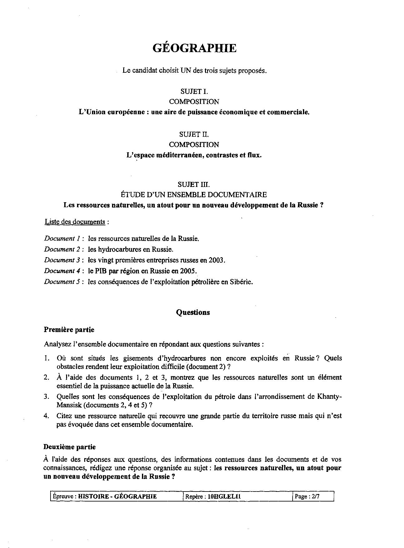 Bac ES-L Histoire Géographie Liban 2010 - Sujet