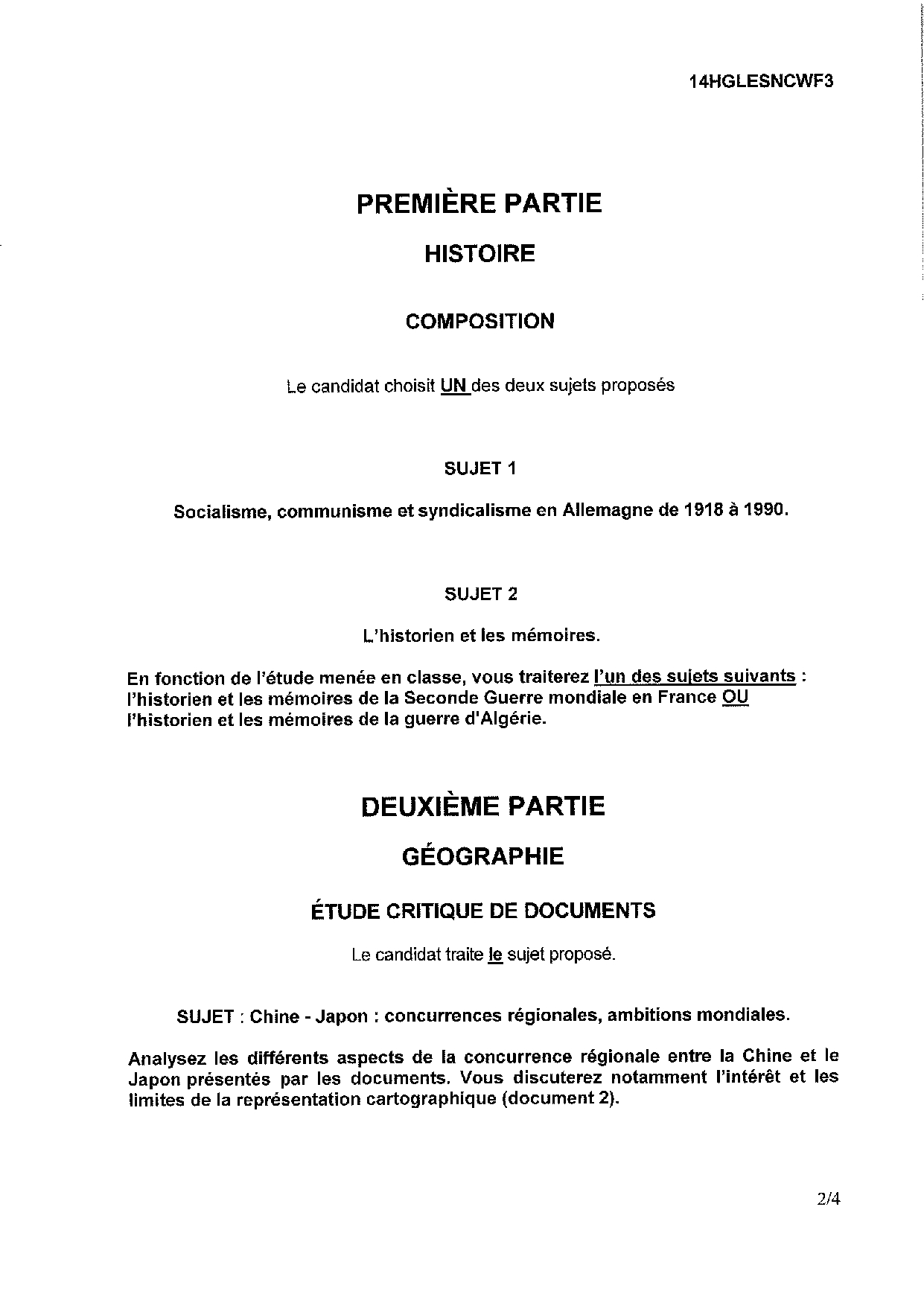 Bac ES-L Histoire Géographie Nouvelle-Calédonie 2014 (Session de remplacement) - Sujet