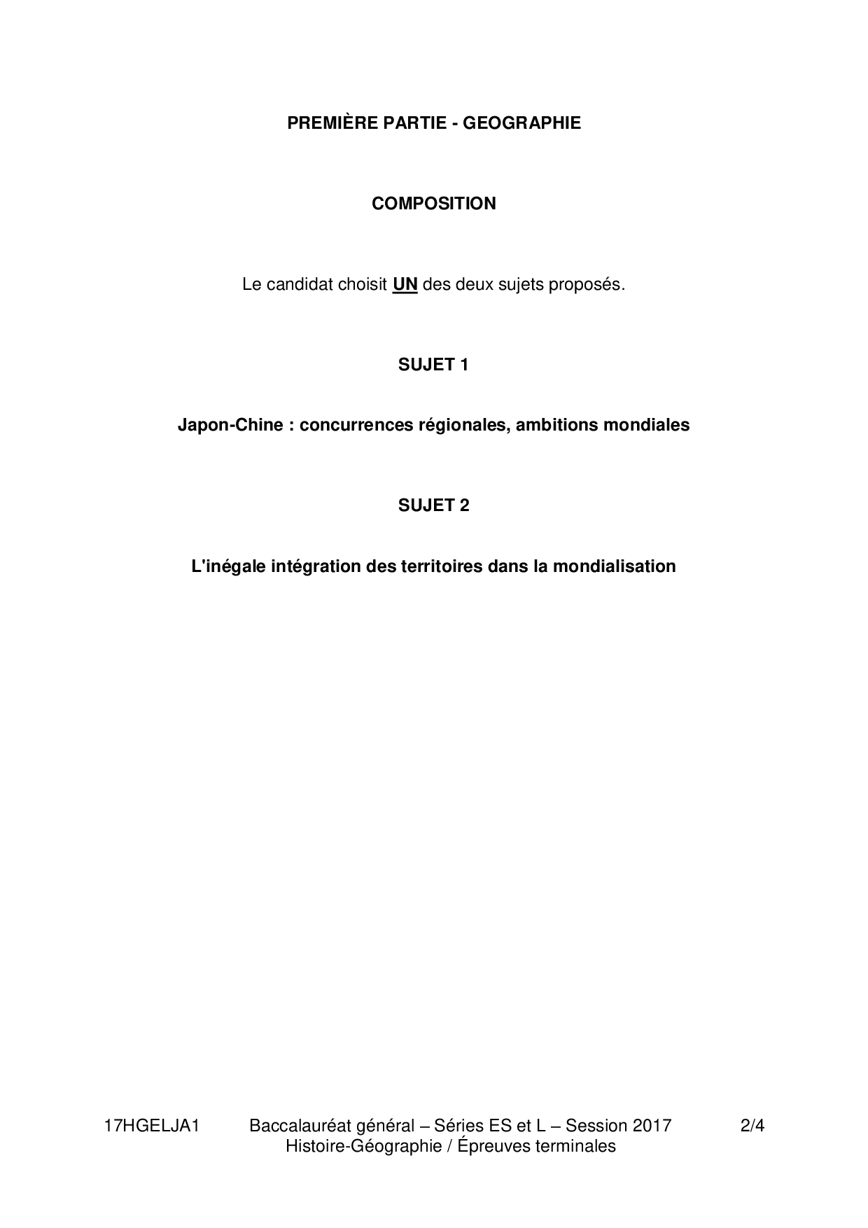Bac ES-L Histoire Géographie Asie 2017 - Sujet