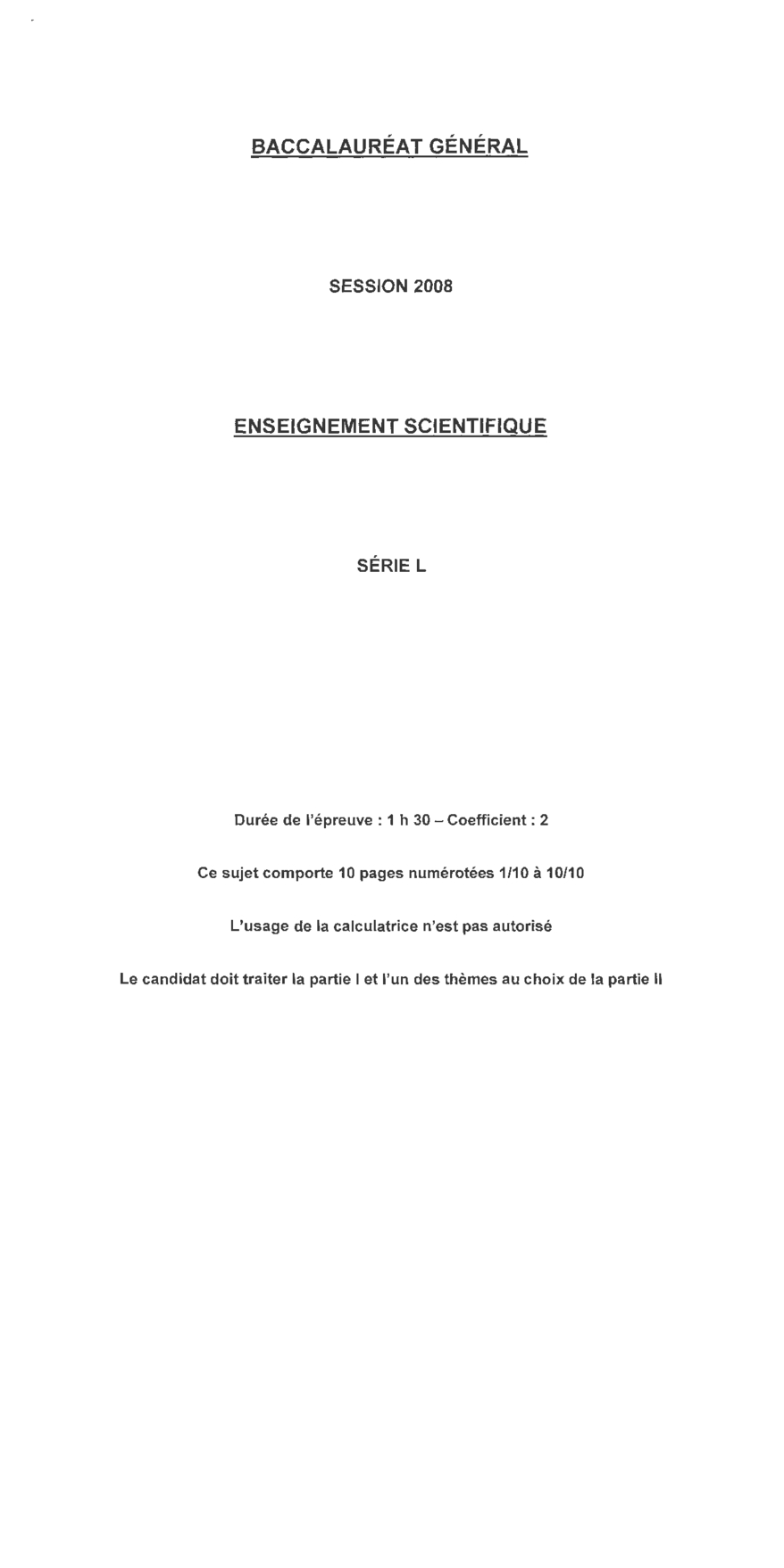 Bac L Sciences (1ère) Amérique du Nord 2008 - Sujet