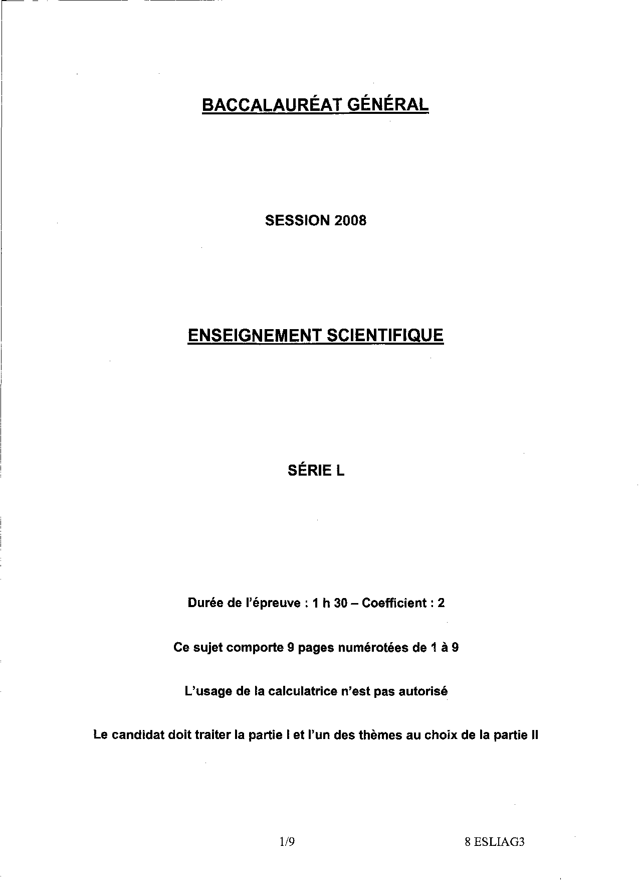 Bac L Sciences (1ère) Antilles-Guyane 2008 (Session de remplacement) - Sujet