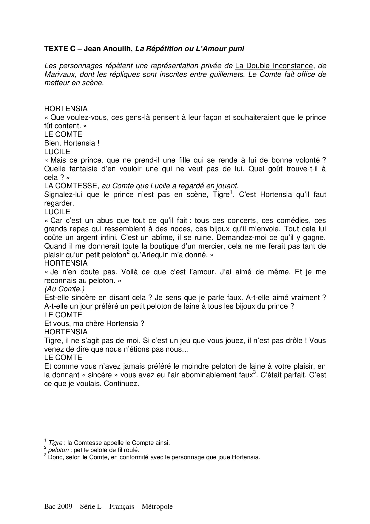 Bac L Français (1ère) Métropole 2009 - Sujet