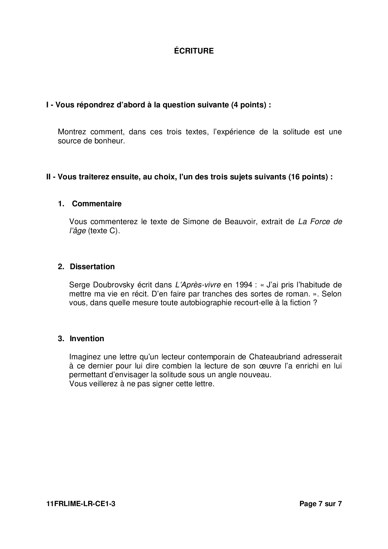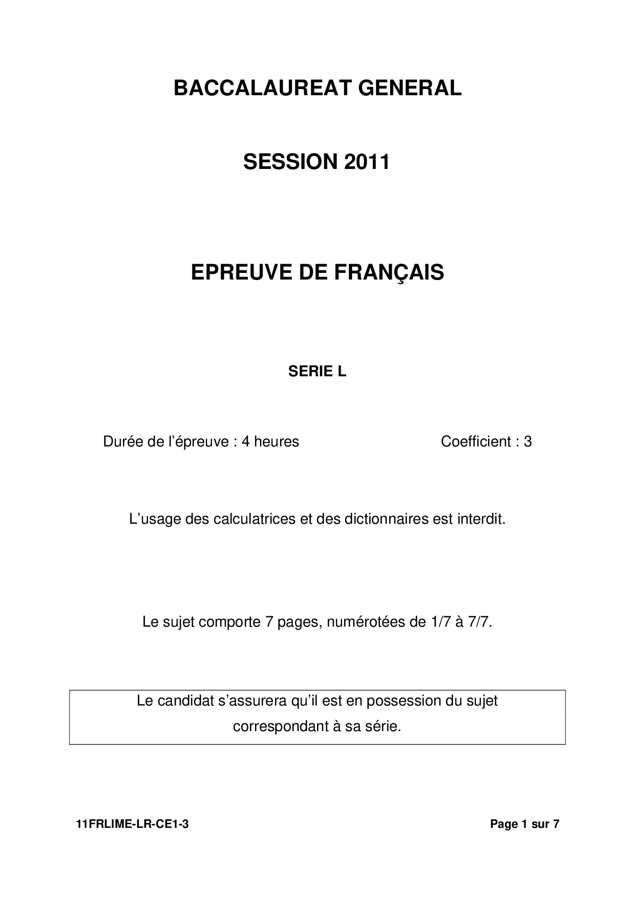 Bac L Français (1ère) Métropole 2011 (Session de remplacement) - Sujet