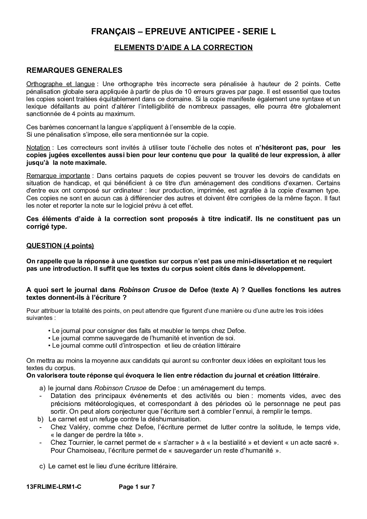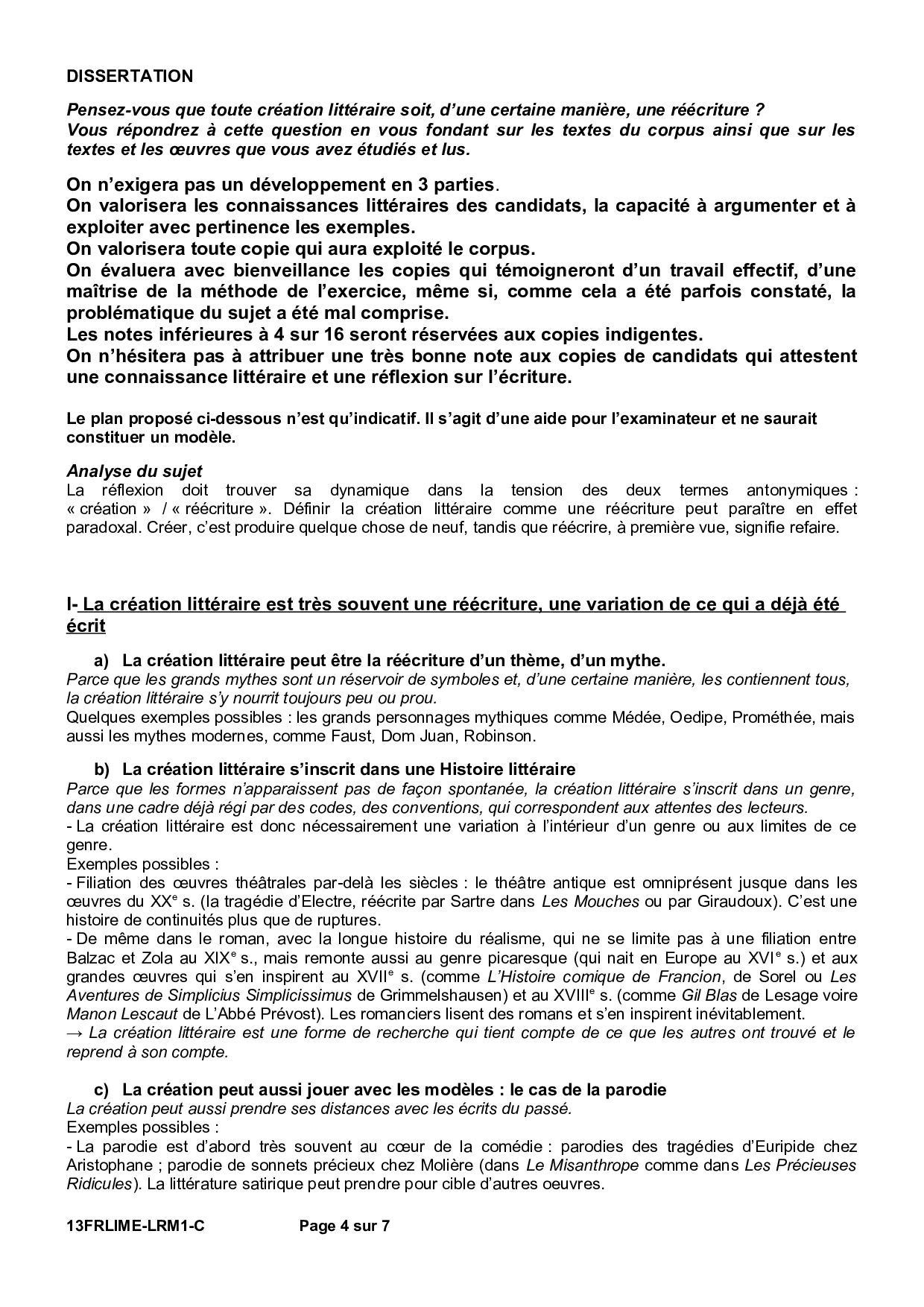 Bac L Français (1ère) Métropole 2013 - Corrigé