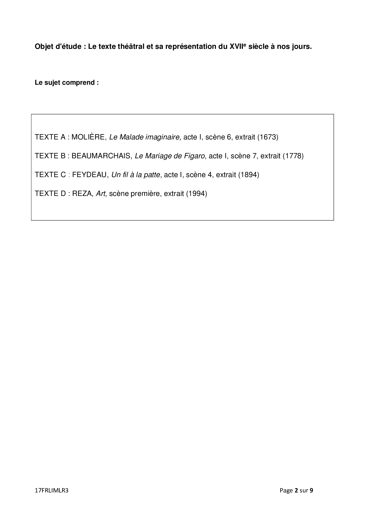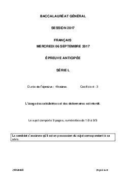 Bac L Français (1ère) Métropole 2017 (Session de remplacement) - Sujet