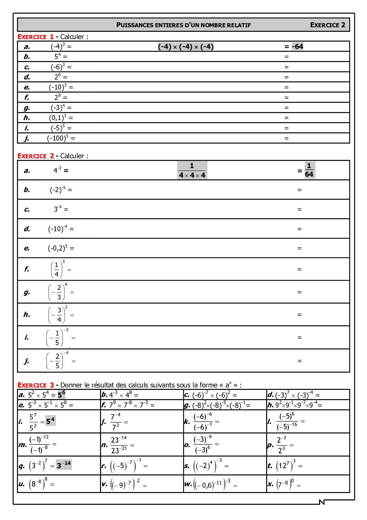 Puissances entières d'un nombre relatif - Exercices