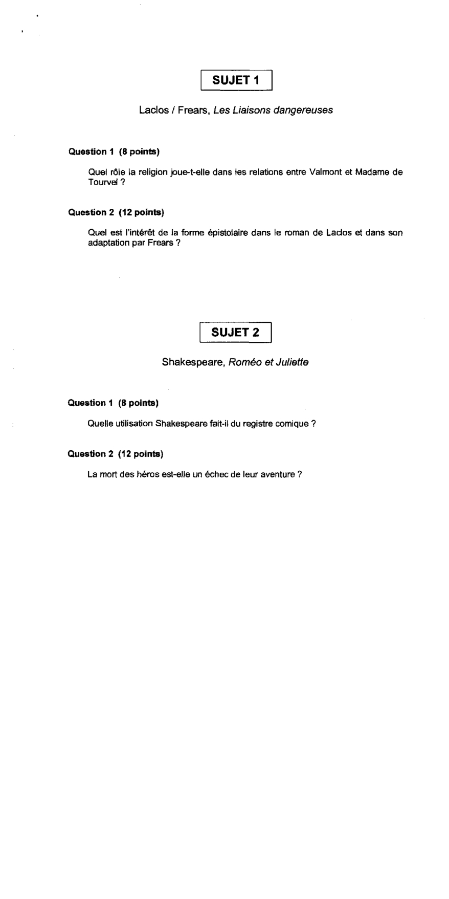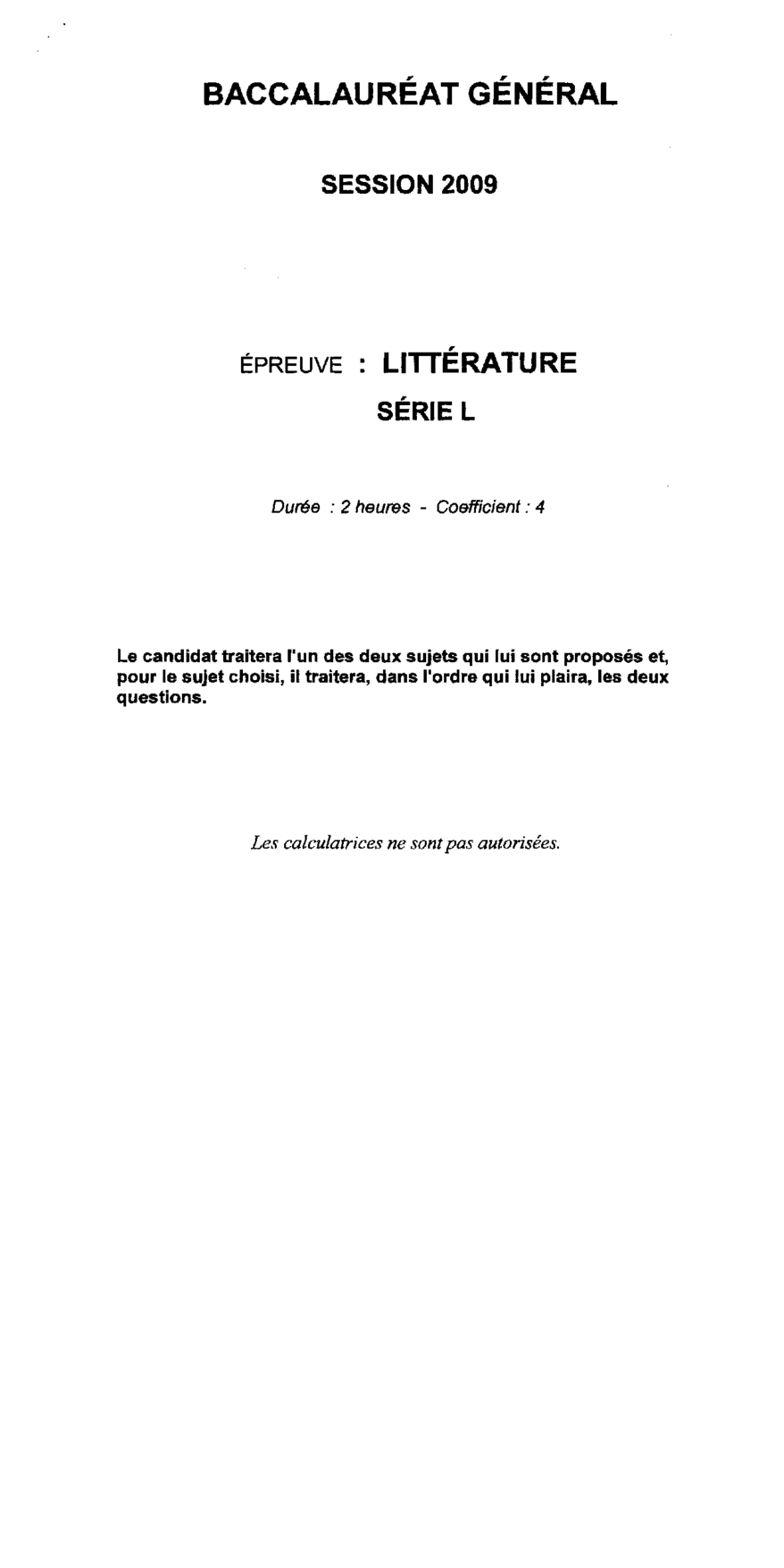 Bac L Littérature Amérique du Nord 2009 - Sujet