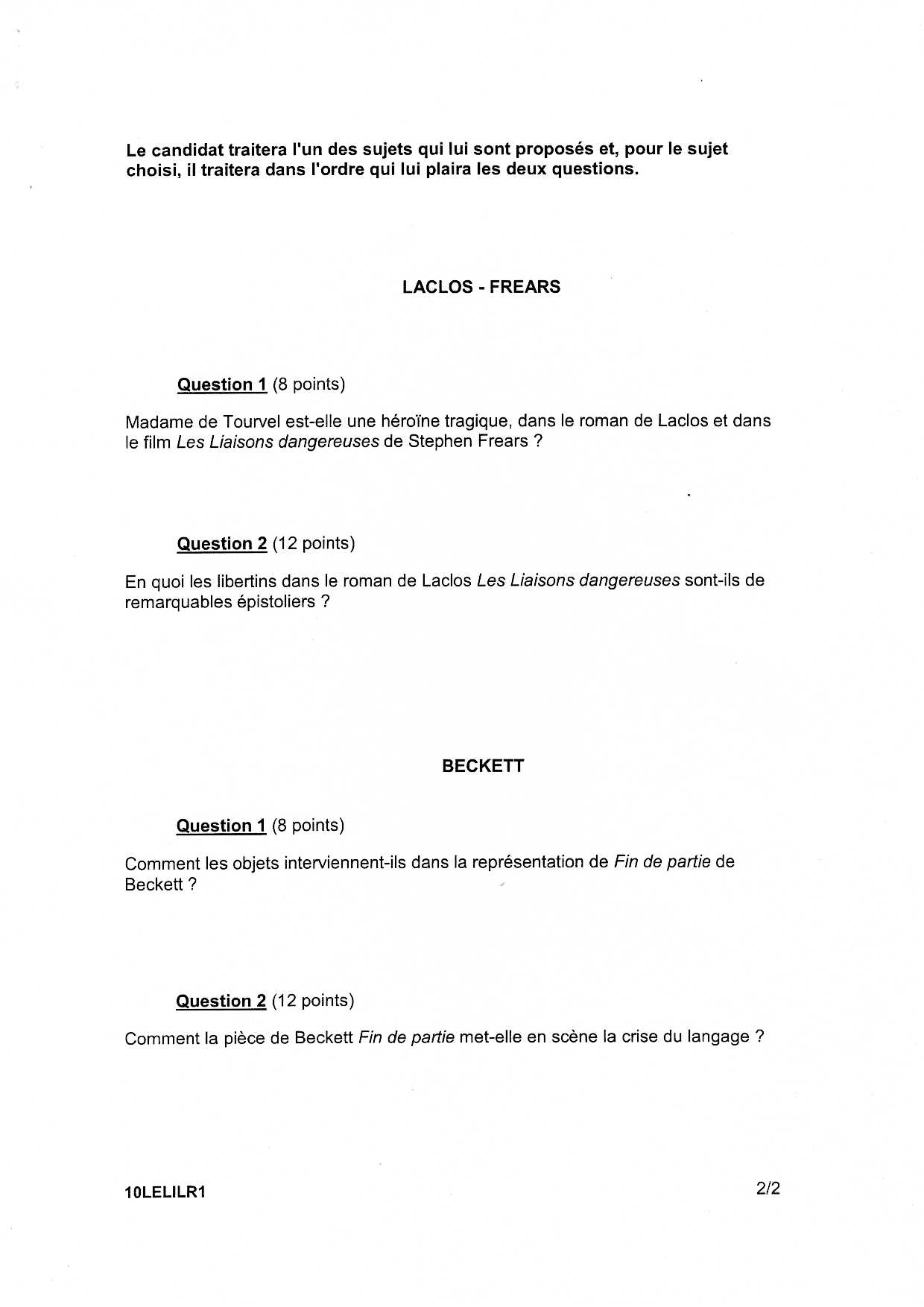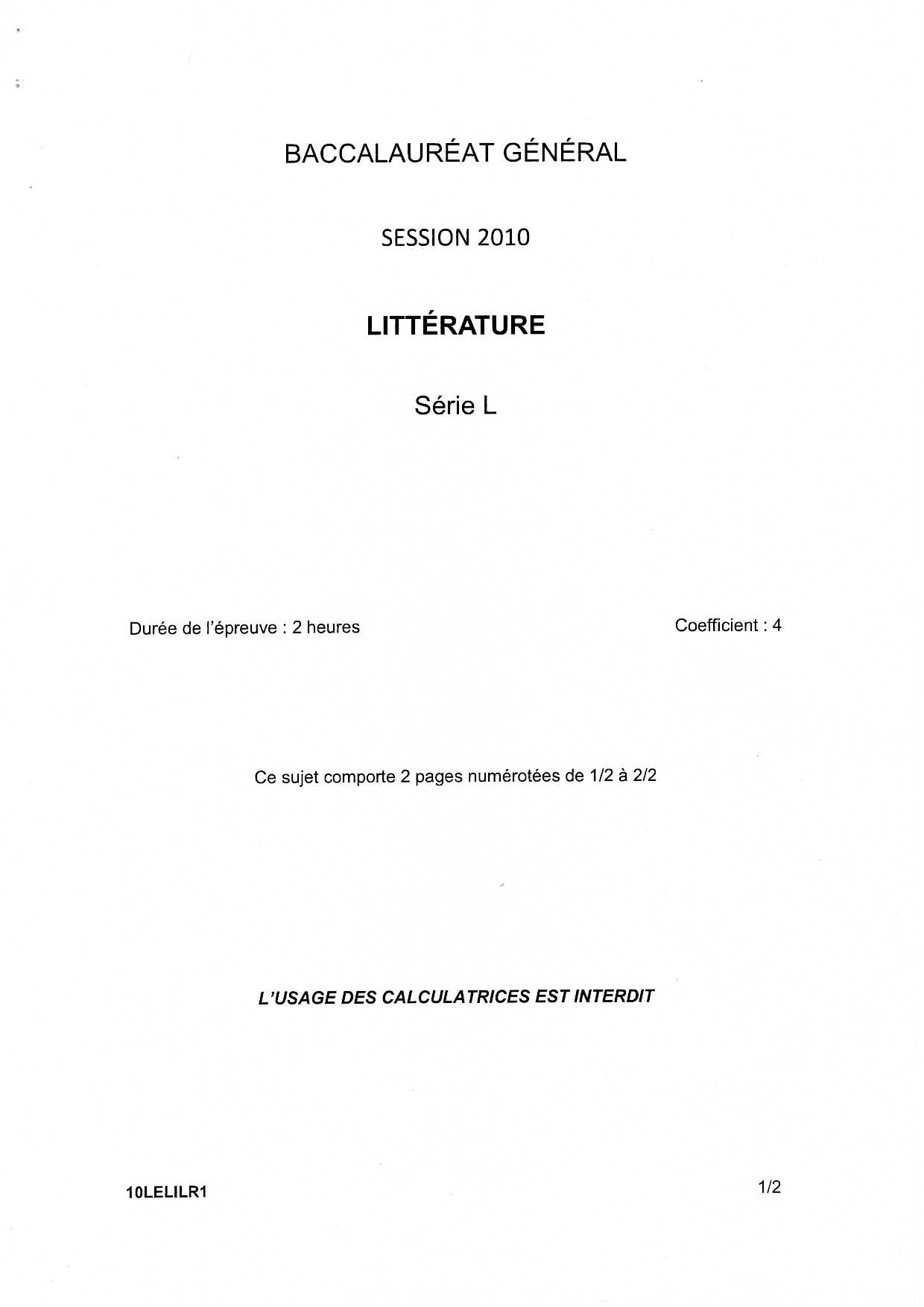 Bac L Littérature La Réunion 2010 - Sujet