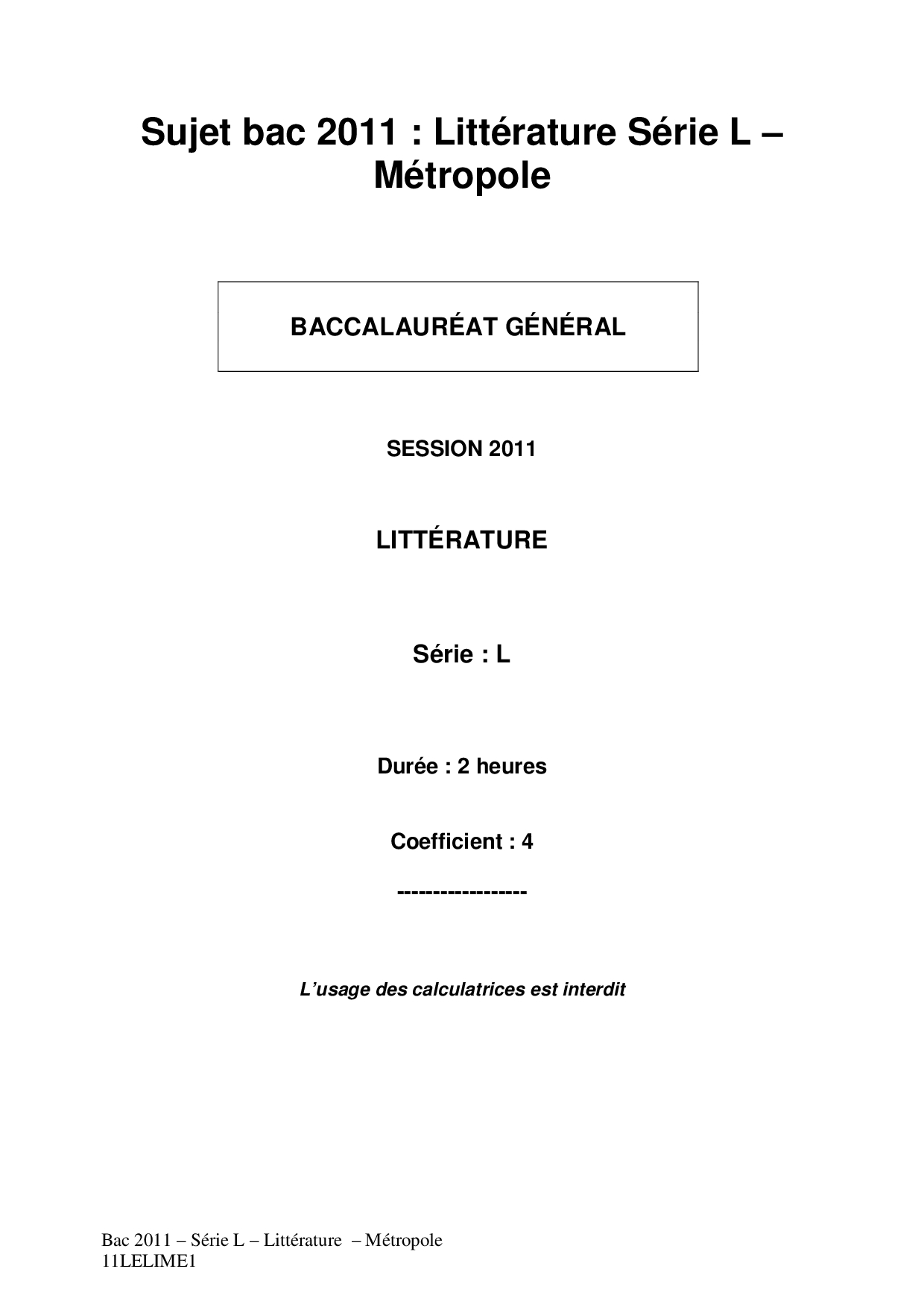 Bac L Littérature Métropole 2011 - Sujet