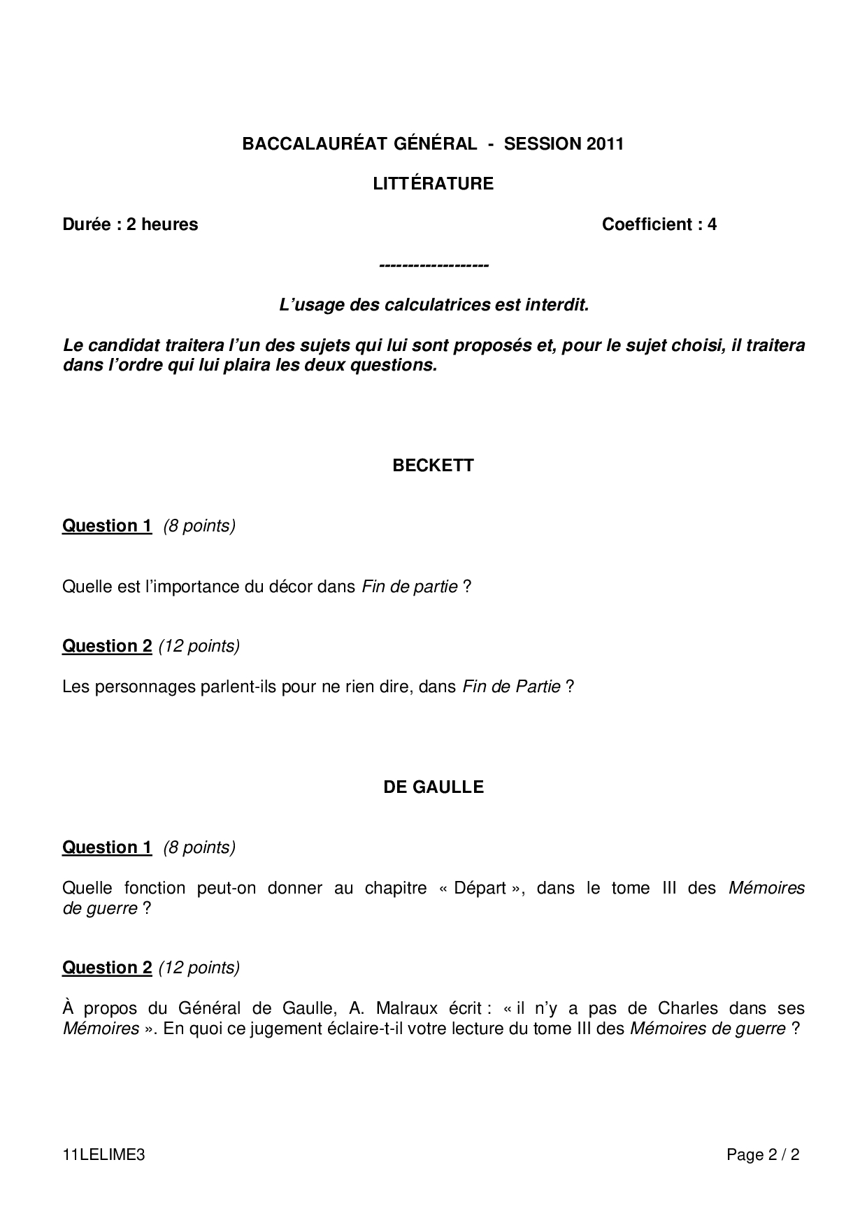 Bac L Littérature Métropole 2011 (Session de remplacement) - Sujet