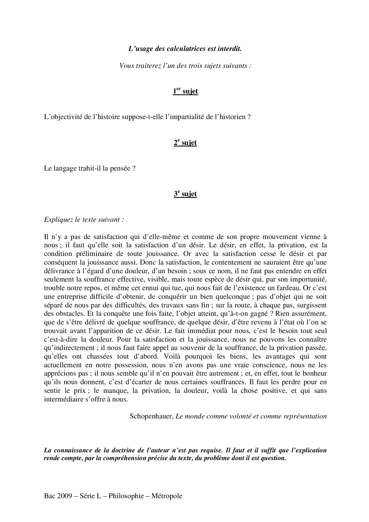 Bac L Philosophie Métropole 2009 - Sujet