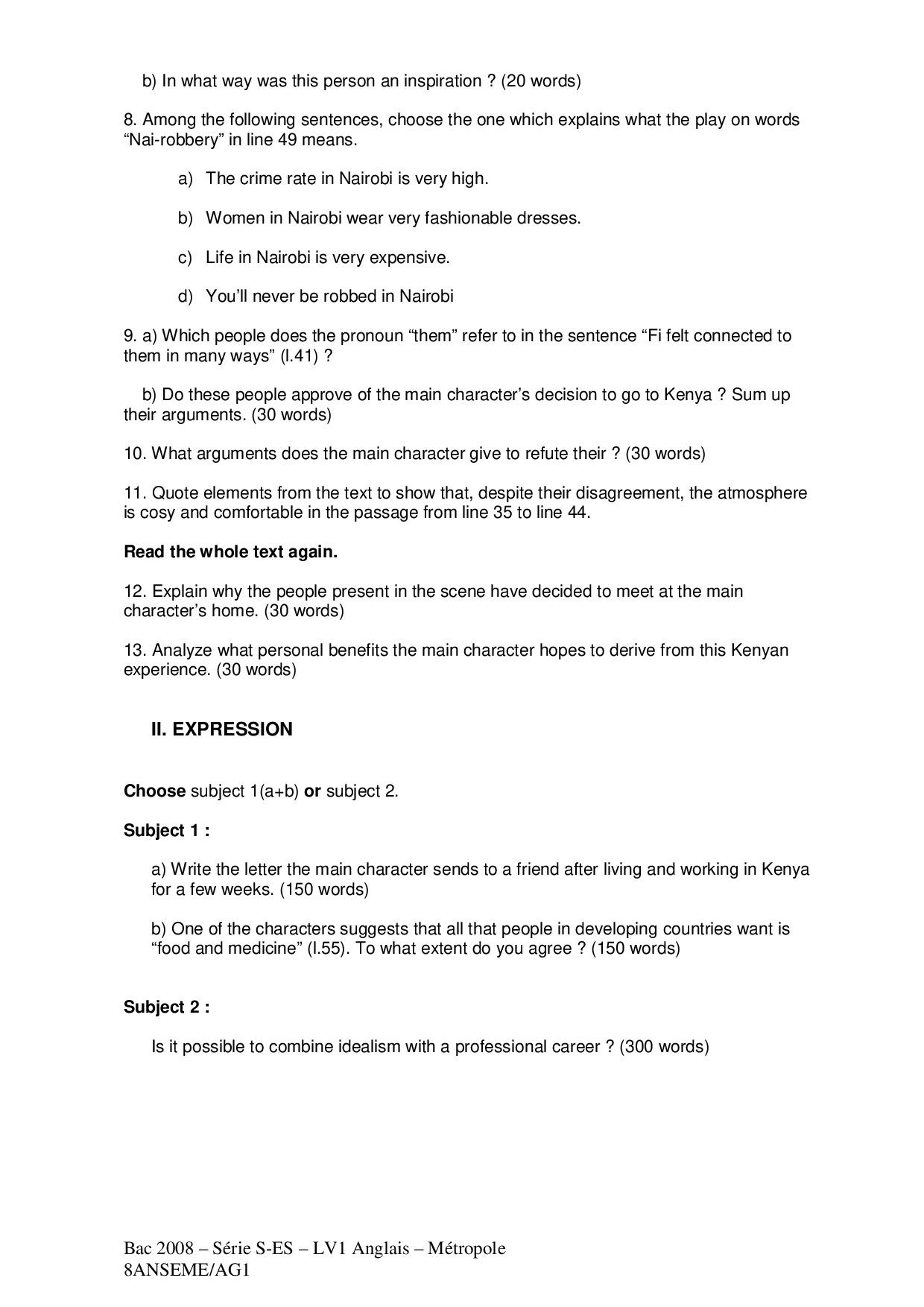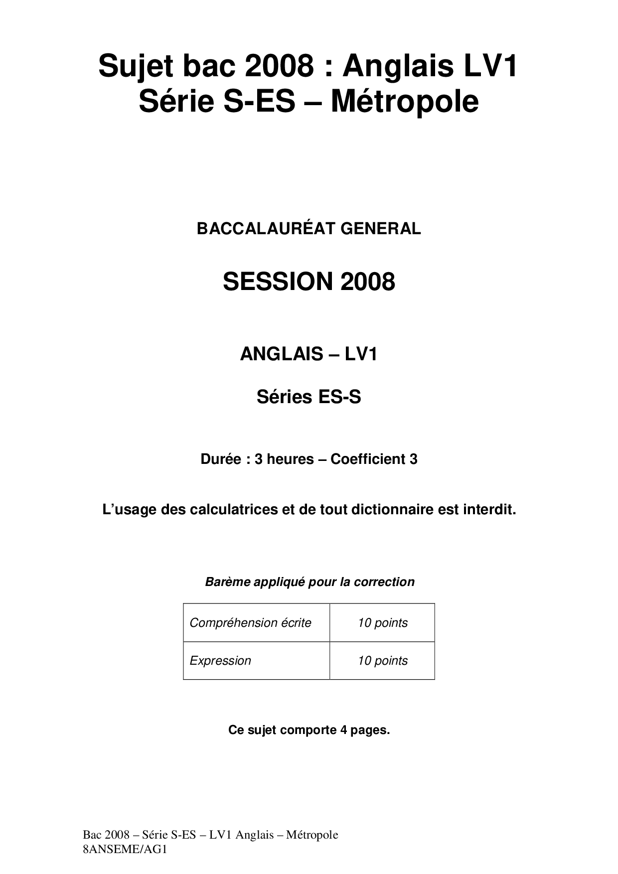 Bac S-ES Anglais LV1 Métropole 2008 - Sujet