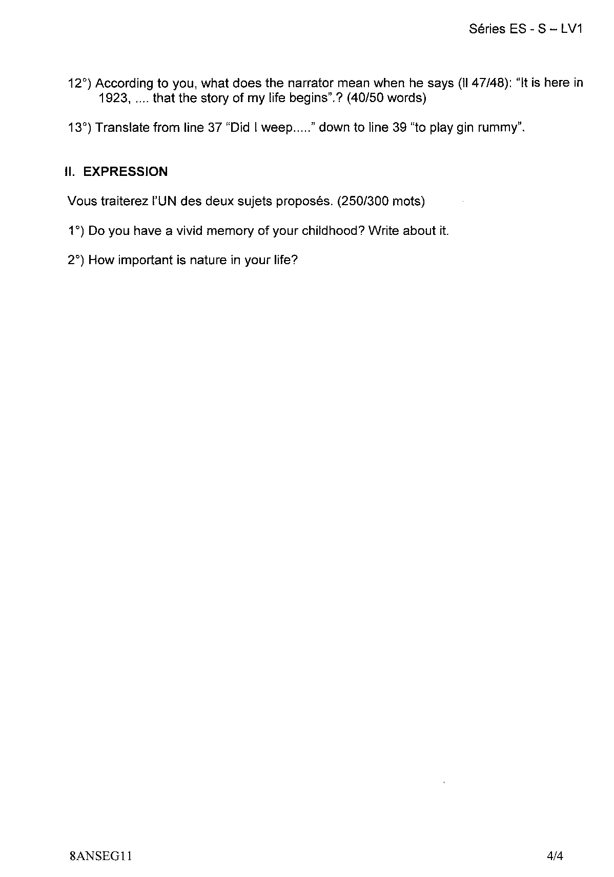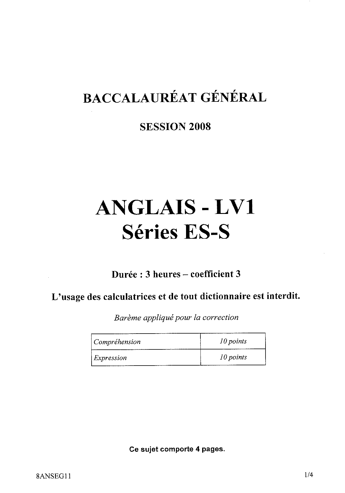 Bac S-ES Anglais LV1 Centres Etrangers Afrique 2008 - Sujet