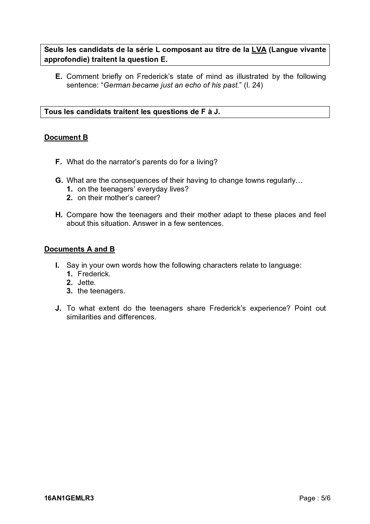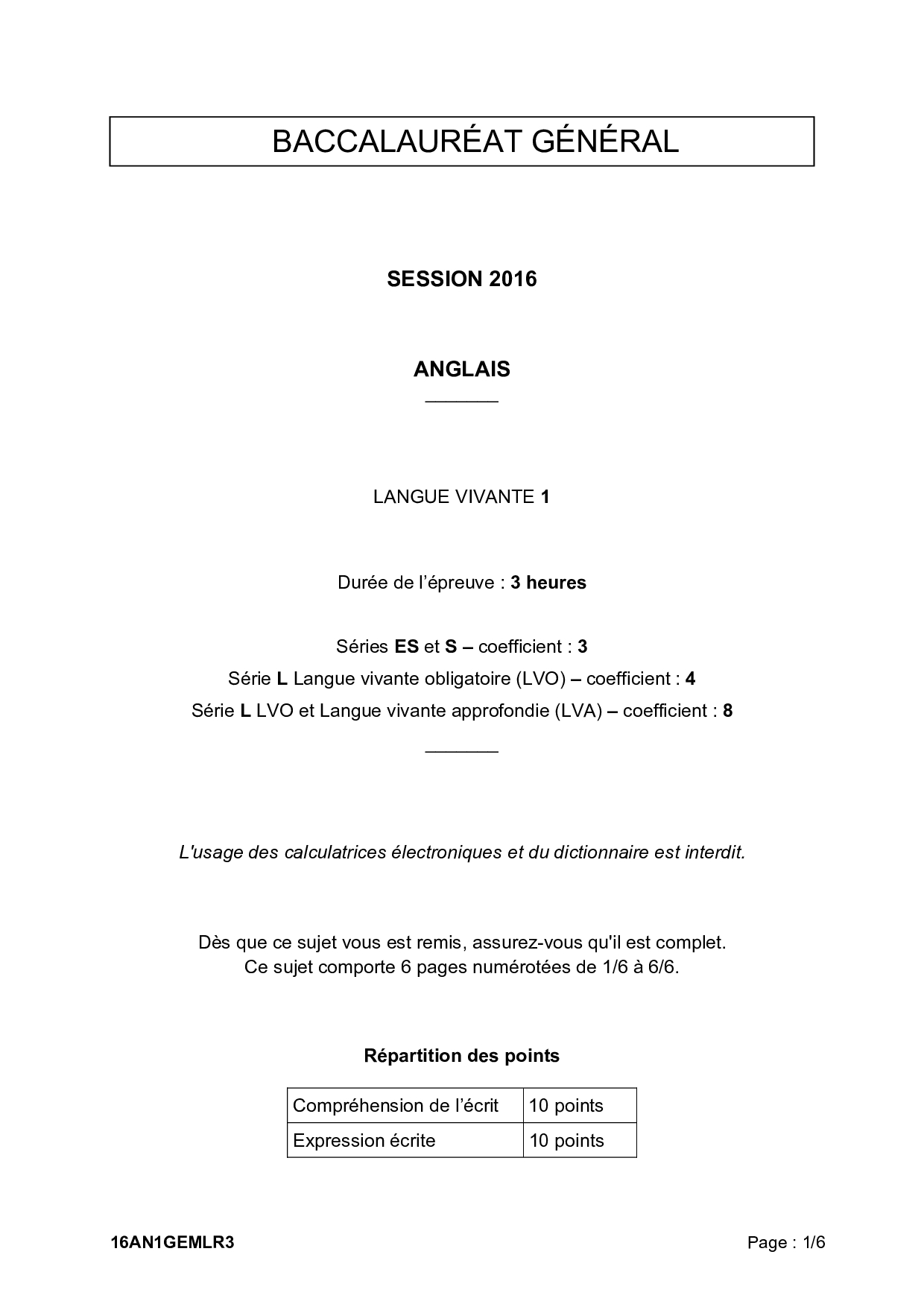 Bac S-ES-L Anglais LV1 Métropole 2016 (Session de remplacement) - Sujet