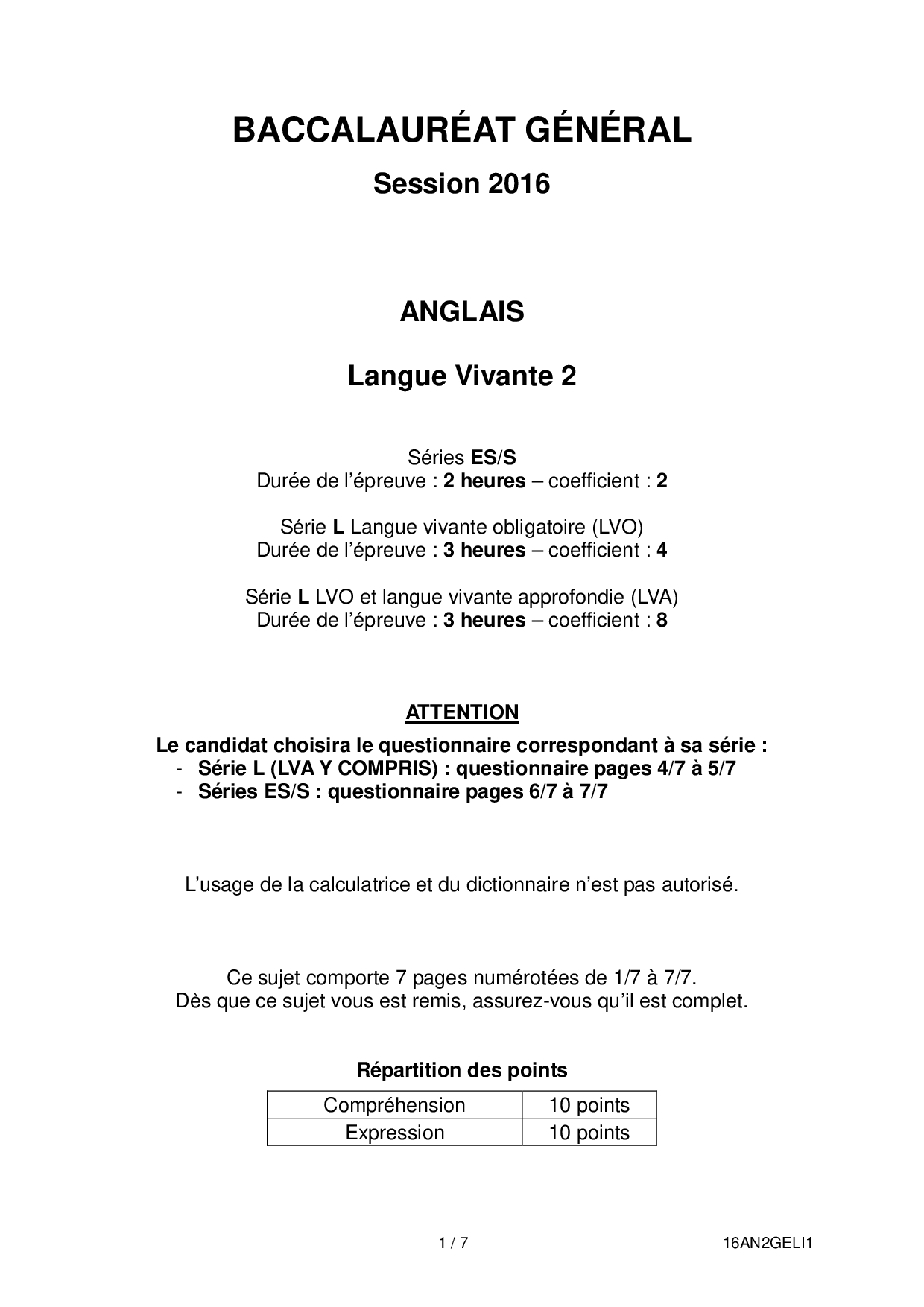 Bac S-ES-L Anglais LV2 Liban 2016 - Sujet