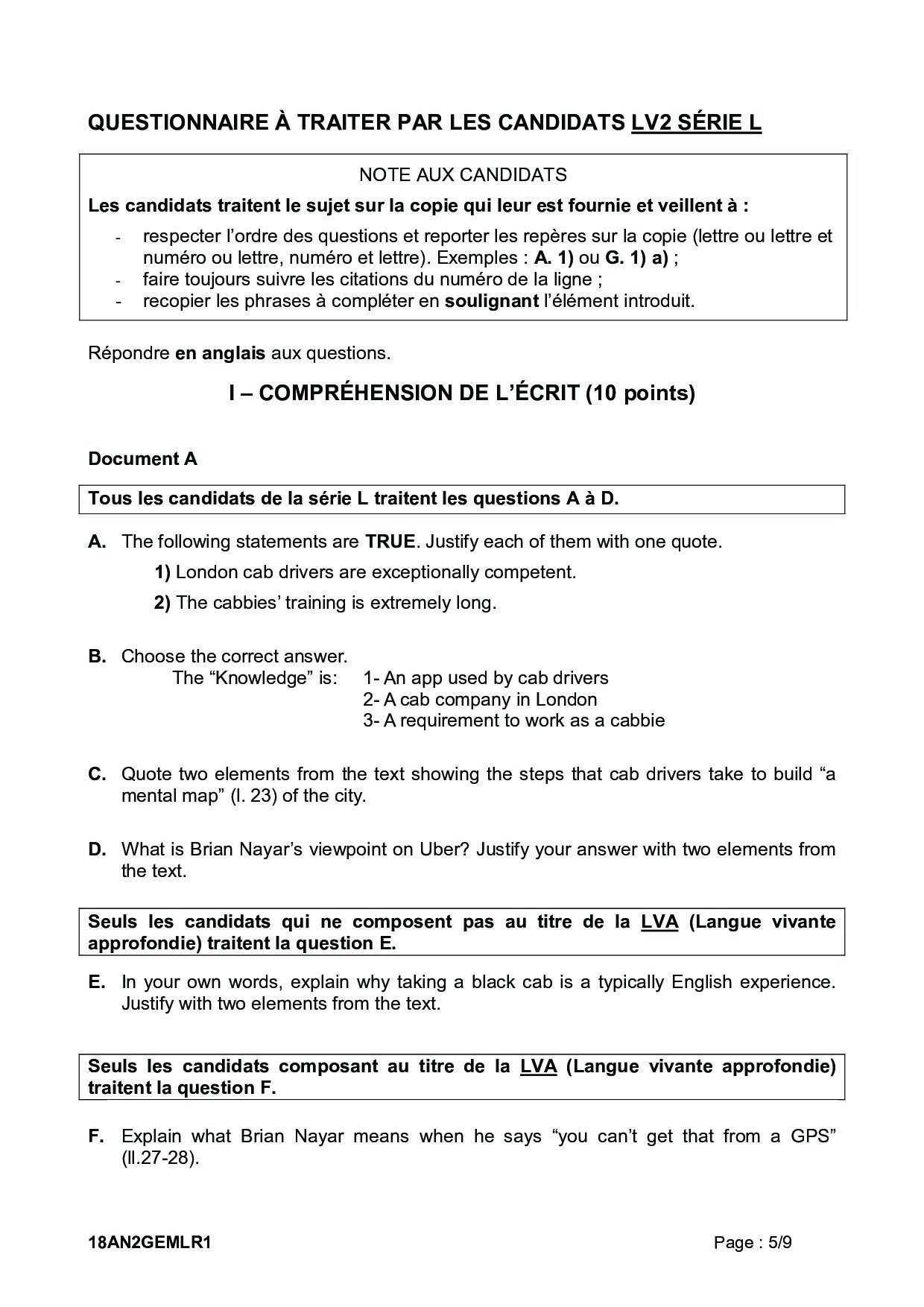 Bac S-ES-L Anglais LV2 Métropole 2018 - Sujet