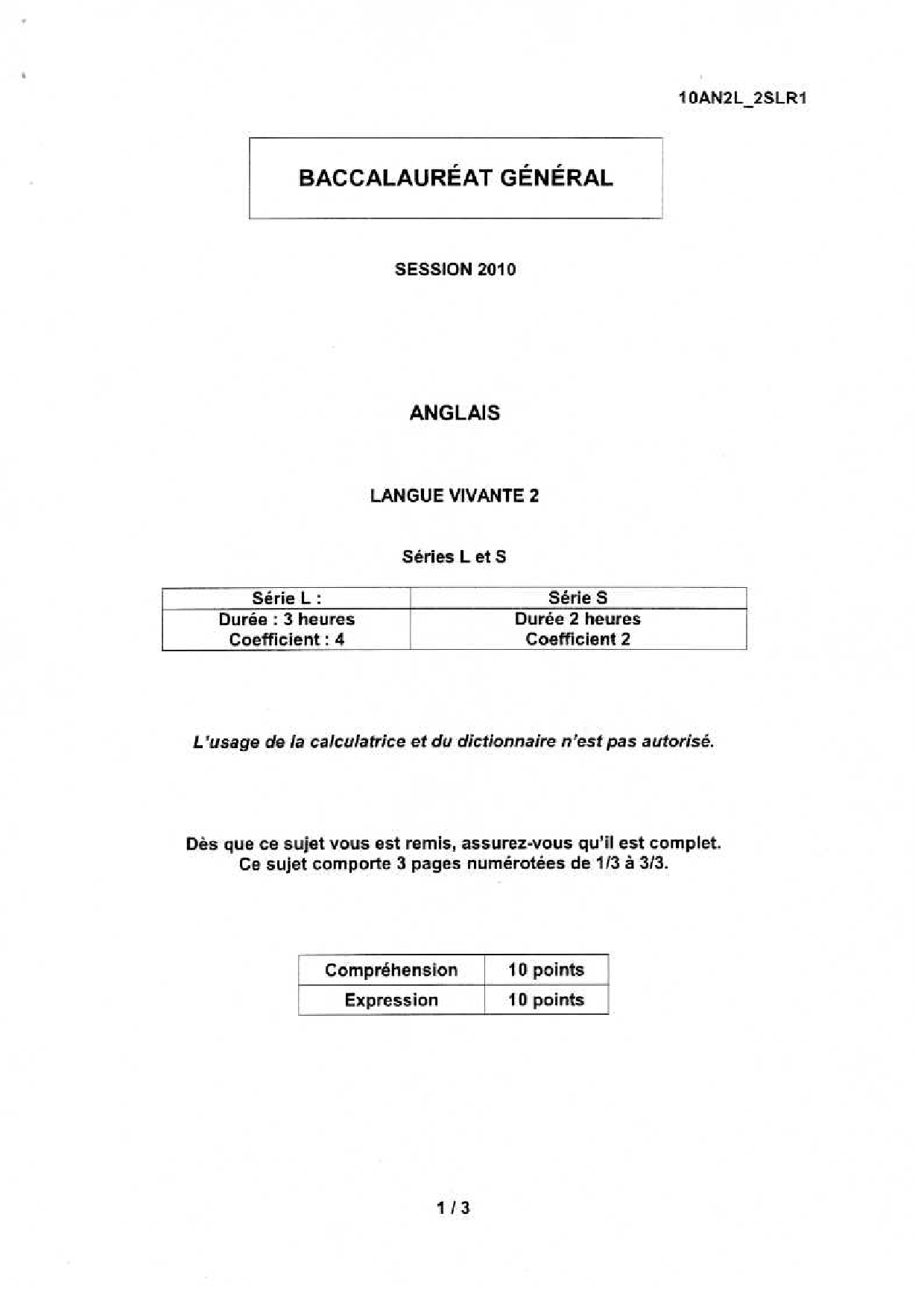 Bac S-L Anglais LV2 La Réunion 2010 - Sujet
