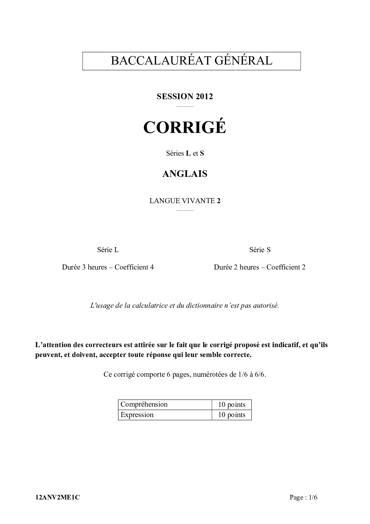 Bac S-L Anglais LV2 Métropole 2012 - Corrigé