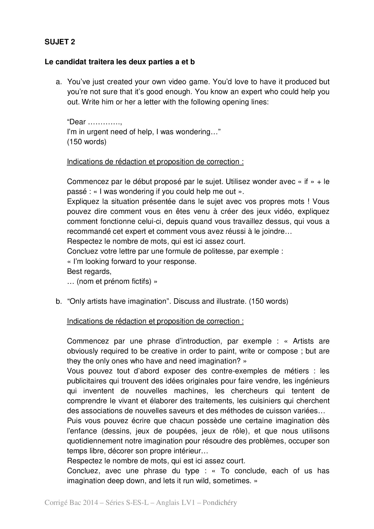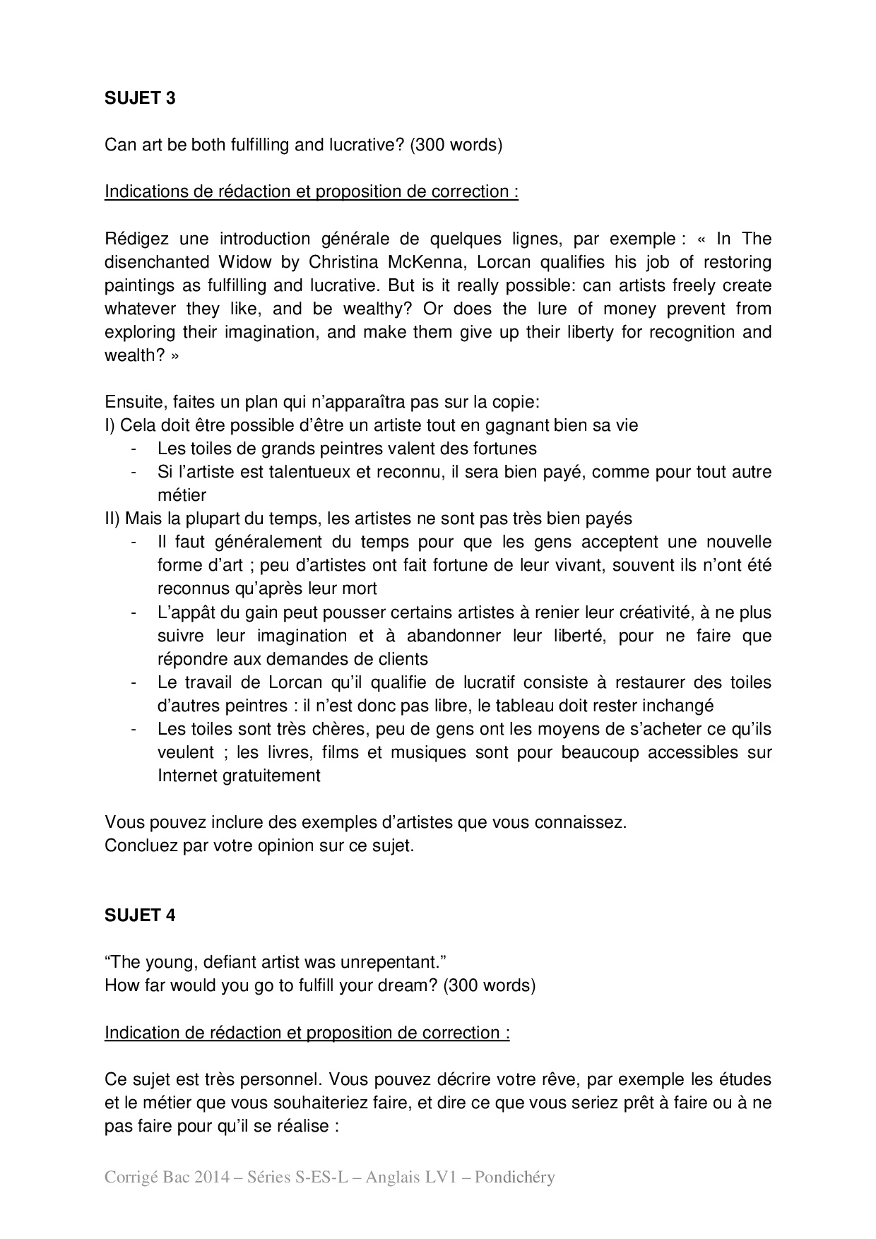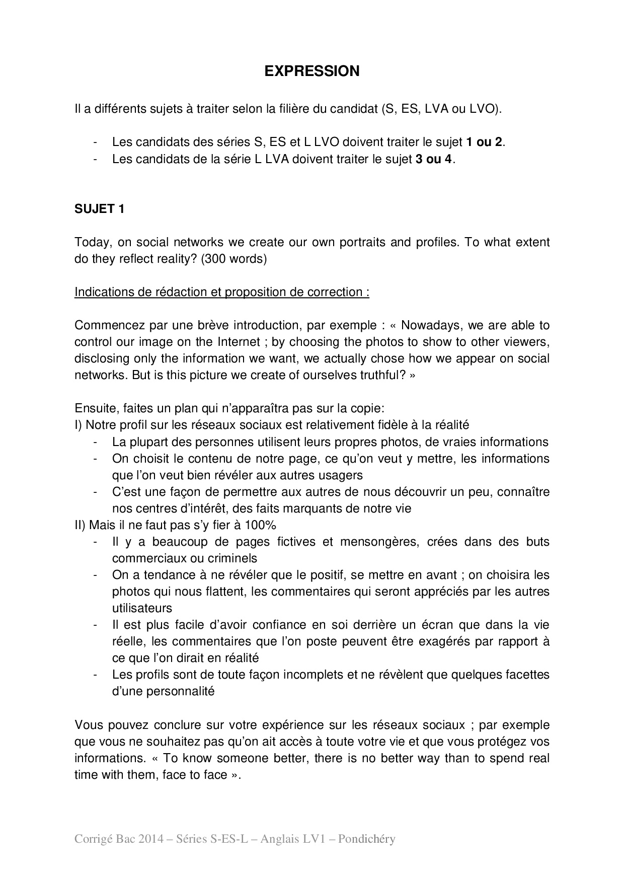 Bac S-ES-L Anglais LV1 Pondichéry 2014 - Corrigé