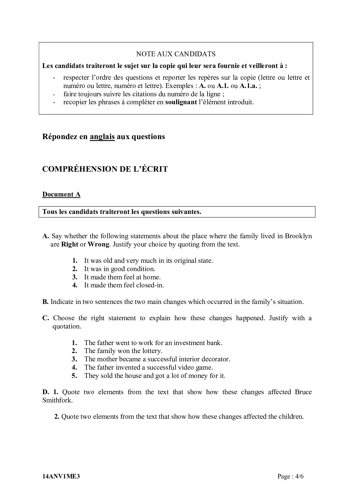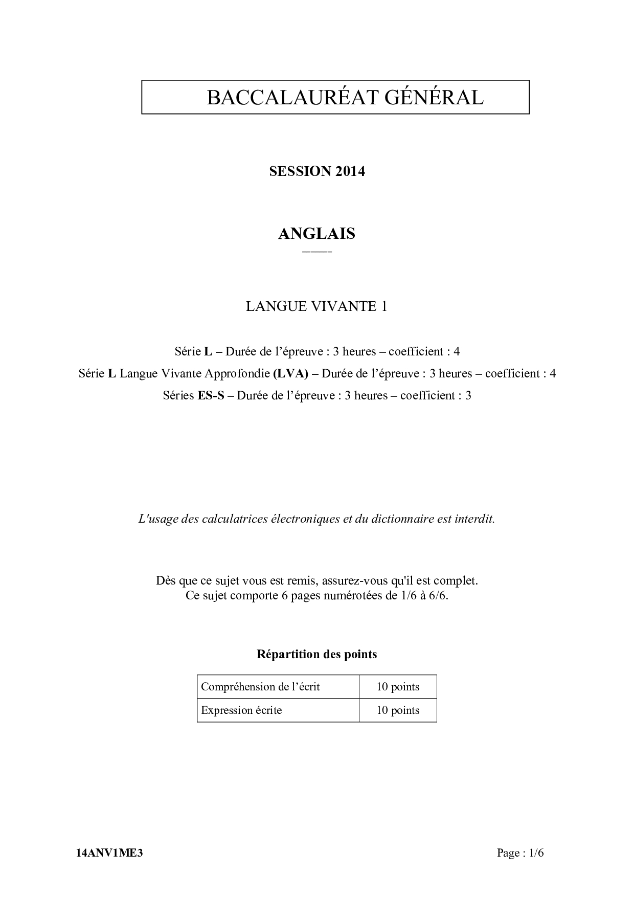 Bac S-ES-L Anglais LV1 Métropole 2014 (Session de remplacement) - Sujet