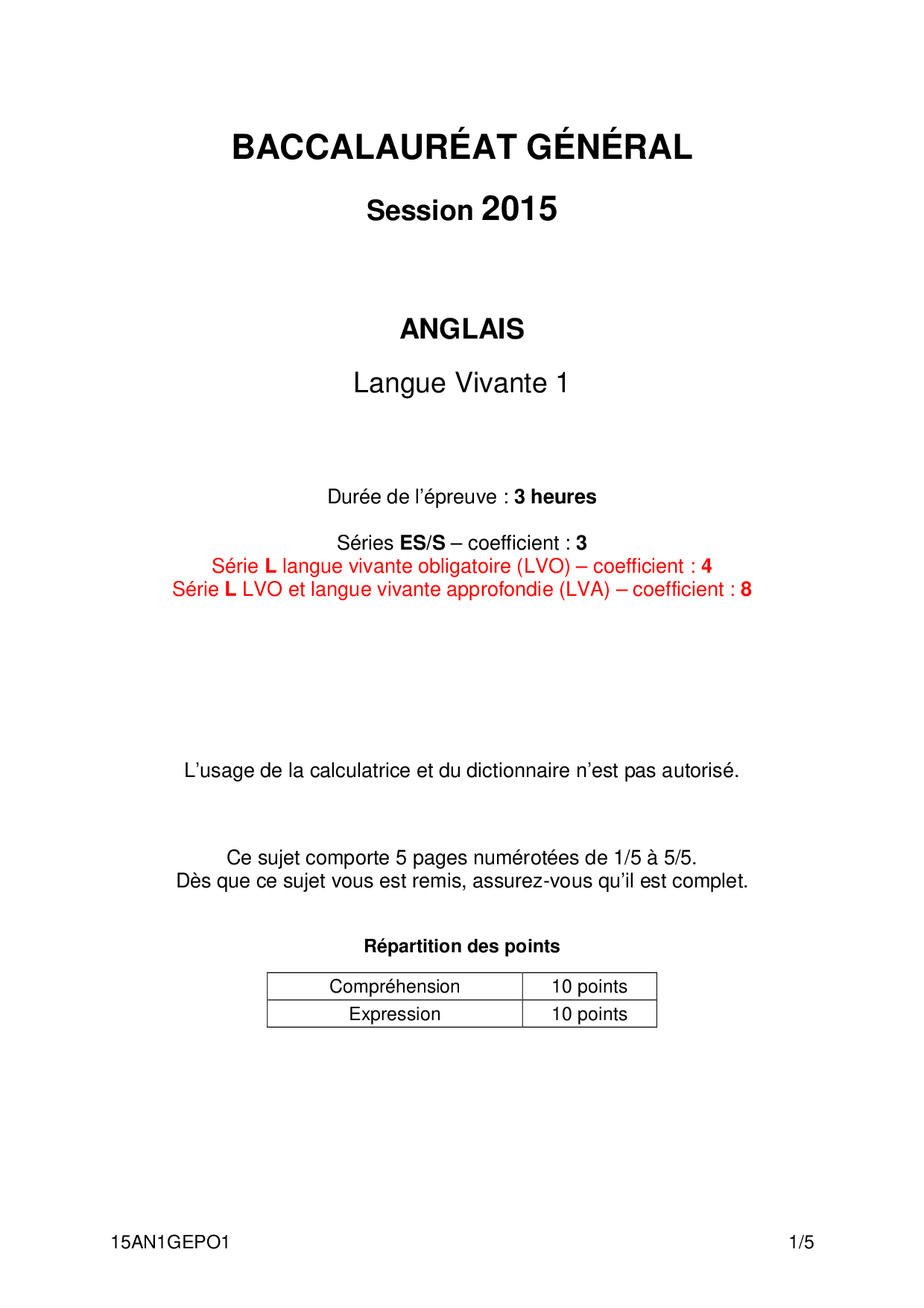 Bac S-ES-L Anglais LV1 Polynésie 2015 - Sujet