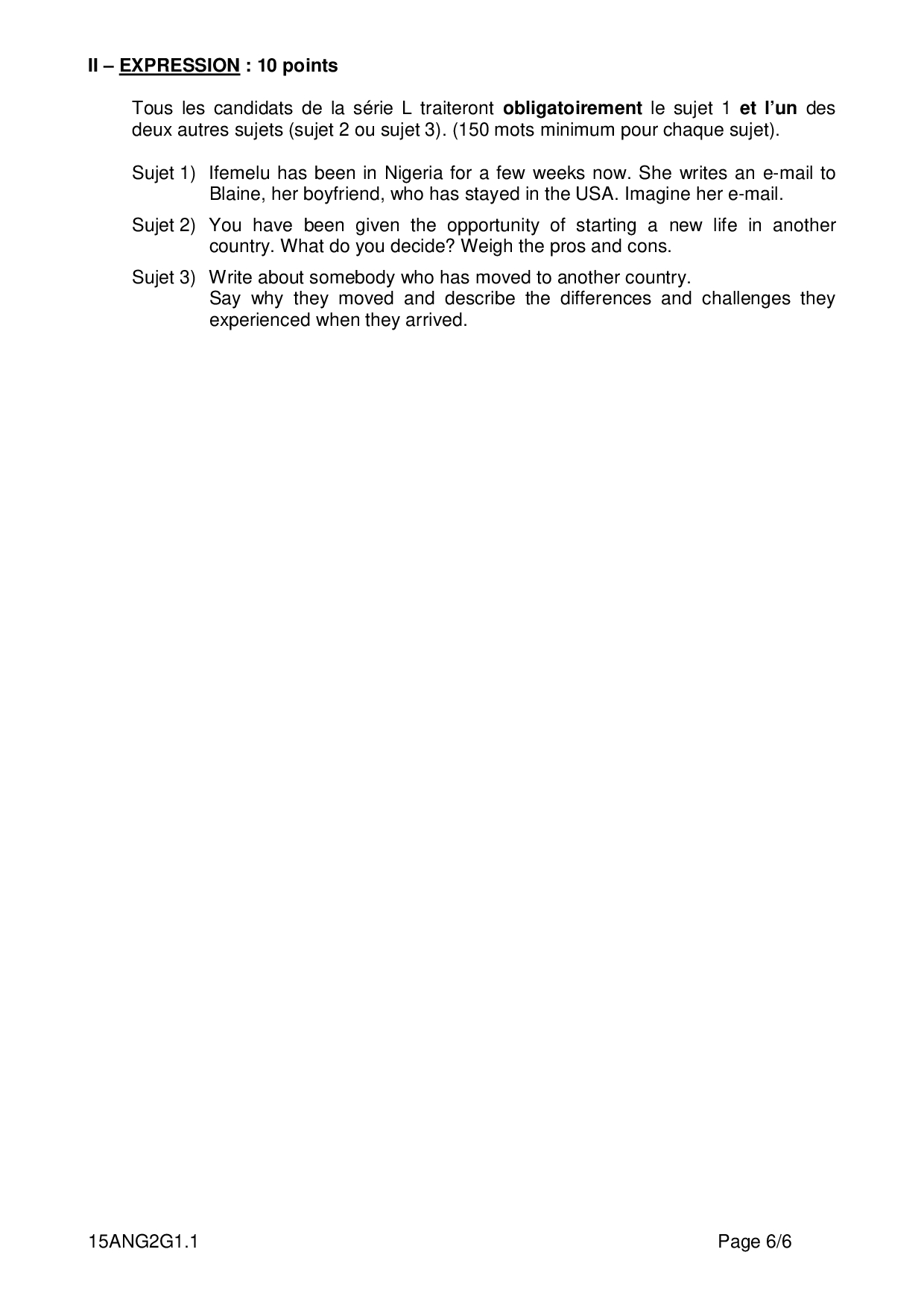 Bac S-ES-L Anglais LV2 Centres Etrangers Afrique 2015 - Sujet