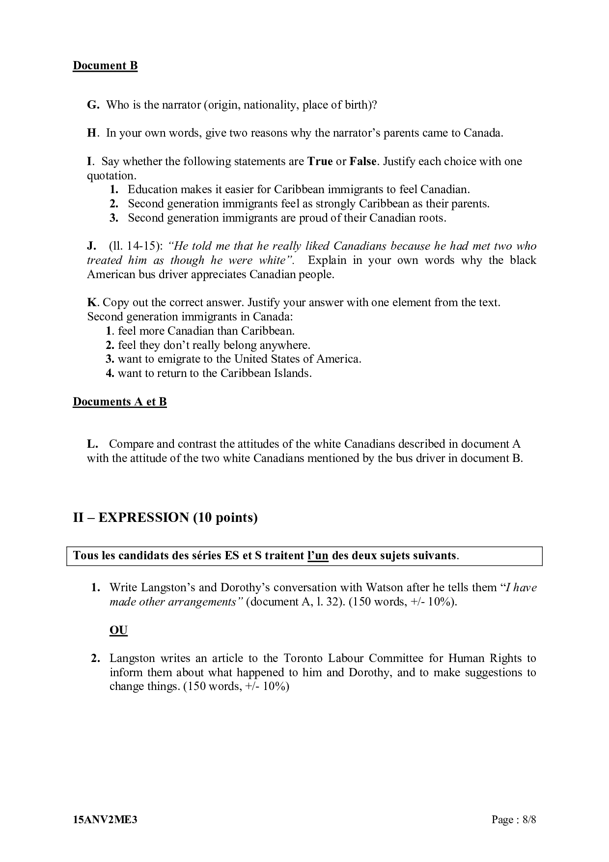 Bac S-ES-L Anglais LV2 Métropole 2015 (Session de remplacement) - Sujet