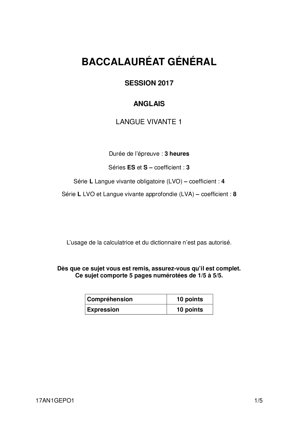 Bac S-ES-L Anglais LV1 Polynésie 2017 - Sujet