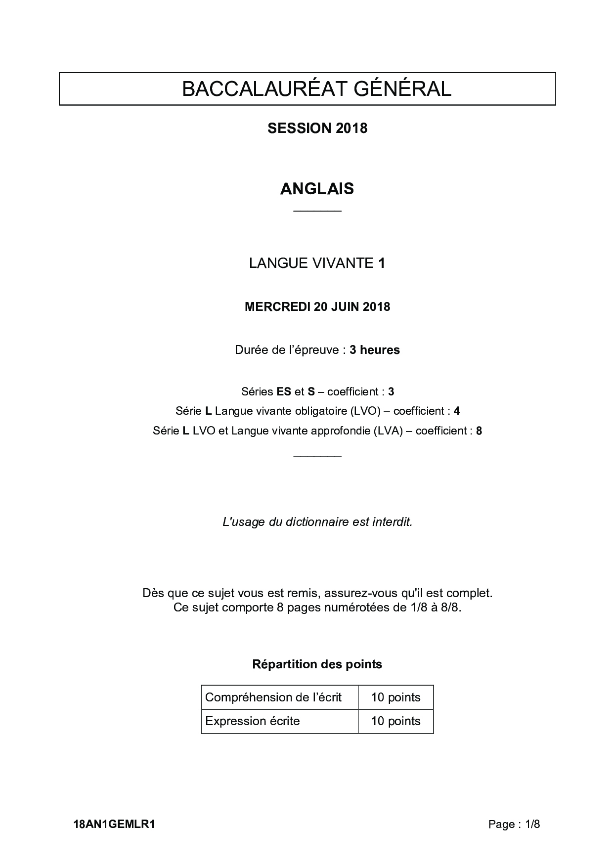 Bac S-ES-L Anglais LV1 Métropole 2018 - Sujet