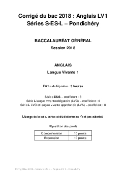 Bac S-ES-L Anglais LV1 Pondichéry 2018 - Corrigé