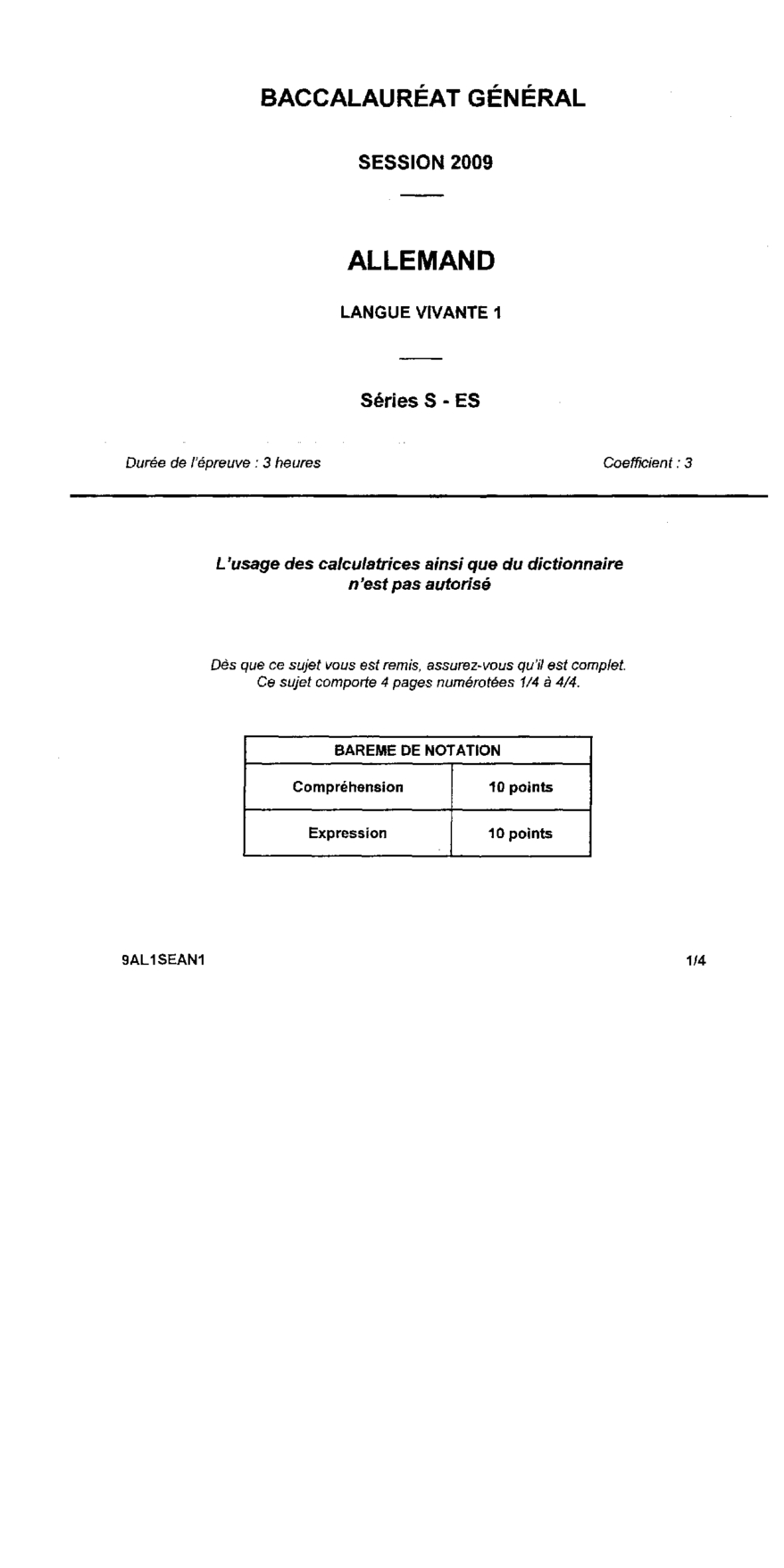 Bac S-ES Allemand LV1 Amérique du Nord 2009 - Sujet